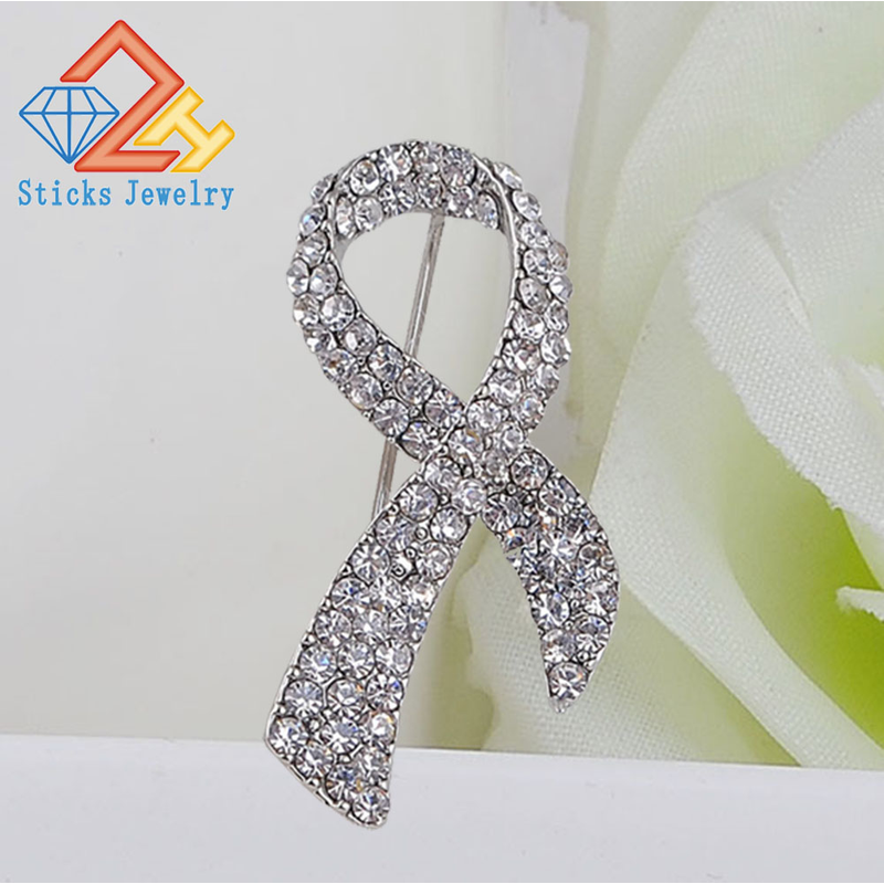 This pink ribbon brooch features a classic design with cubic zirconia, making it a fashionable accessory for any outfit.