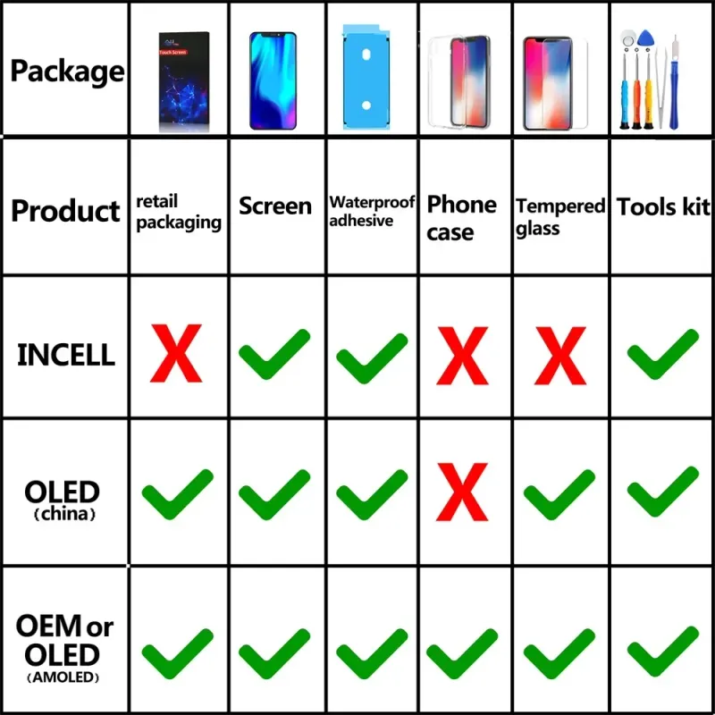 OLED(China):packaging×1 screen×1 waterproof ashesive×1 tempered glass×1 tools kit×1