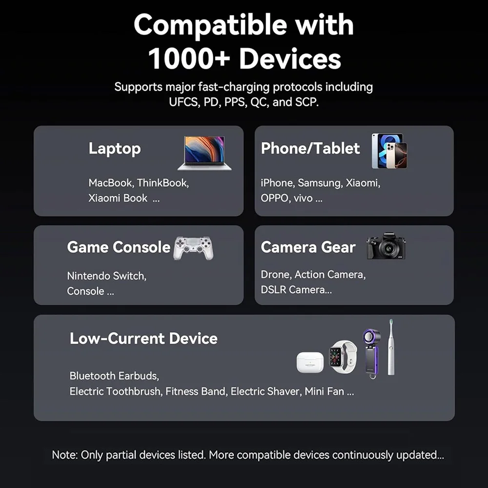 Supports major fast-charging protocols including UFCS, PD, PPS, QC, and SCP. Compatible with laptops, phones, tablets, game consoles, game gears, and low current devices etc.