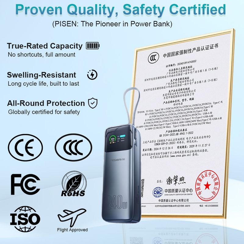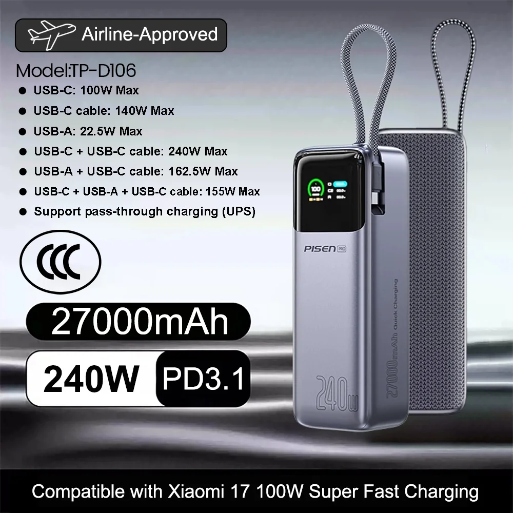 PISEN 240W Power Bank With Fast Charging Cable 27000mAh Portable PD3.1 CCC Powerbank for Laptop Notebook iPhone External Battery