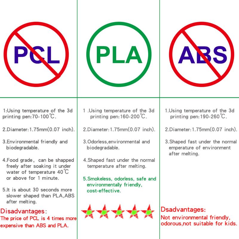 1: This product is 3D printing pen consumables, color PLA consumables. Smokeless and tasteless, safe and environmentally friendly. The diameter is 1.75mm, and the working temperature needs to be 160-200 degrees Celsius. Please confirm whether your printing pen can be used before purchasing.
