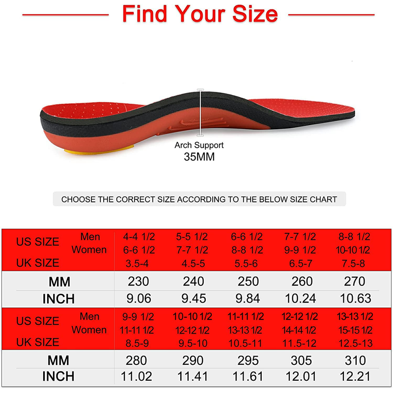 3.5 CM outer semi-rigid arch support,firm but flexible,deep heel cradle for increased stability. This insert works for neutral, low and high arches.
