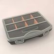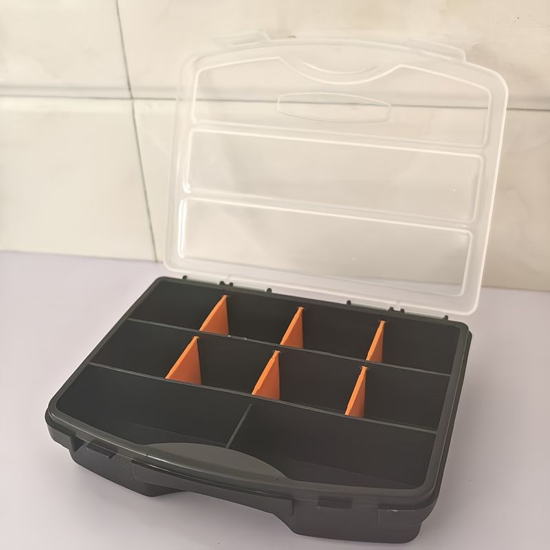 The tool storage box features adjustable compartments, allowing you to customize the space for various hardware sizes.