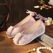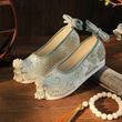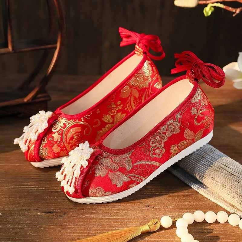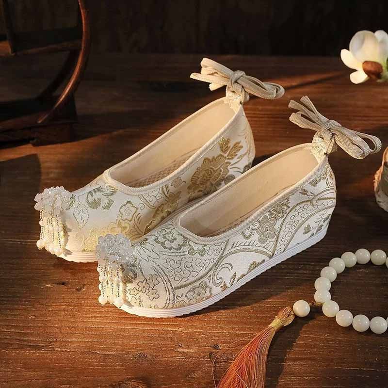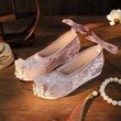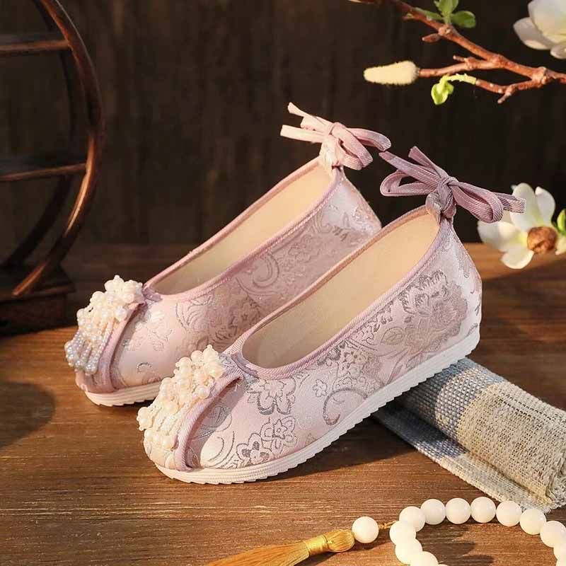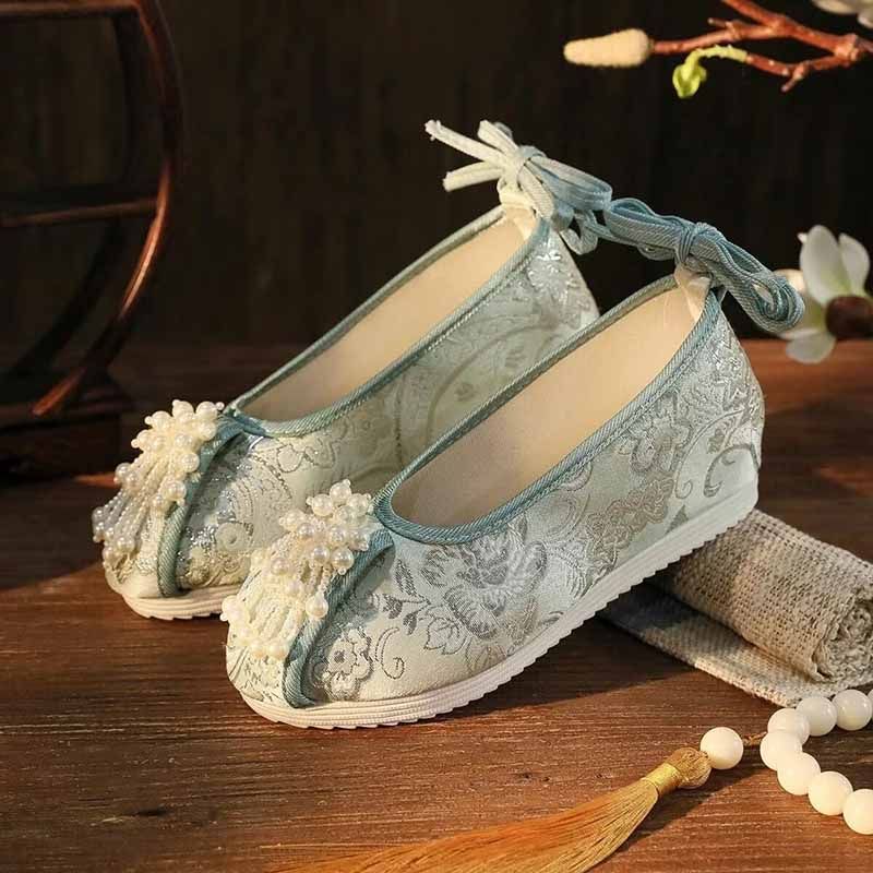 Featuring intricate green and pink embroidery, these shoes blend traditional Hanfu aesthetics with modern style.