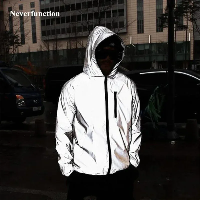 Plus Size 4XL Men Spring Autumn full reflective Windbreaker waterproof Jacket male High street hip hop Loose Hooded Coats