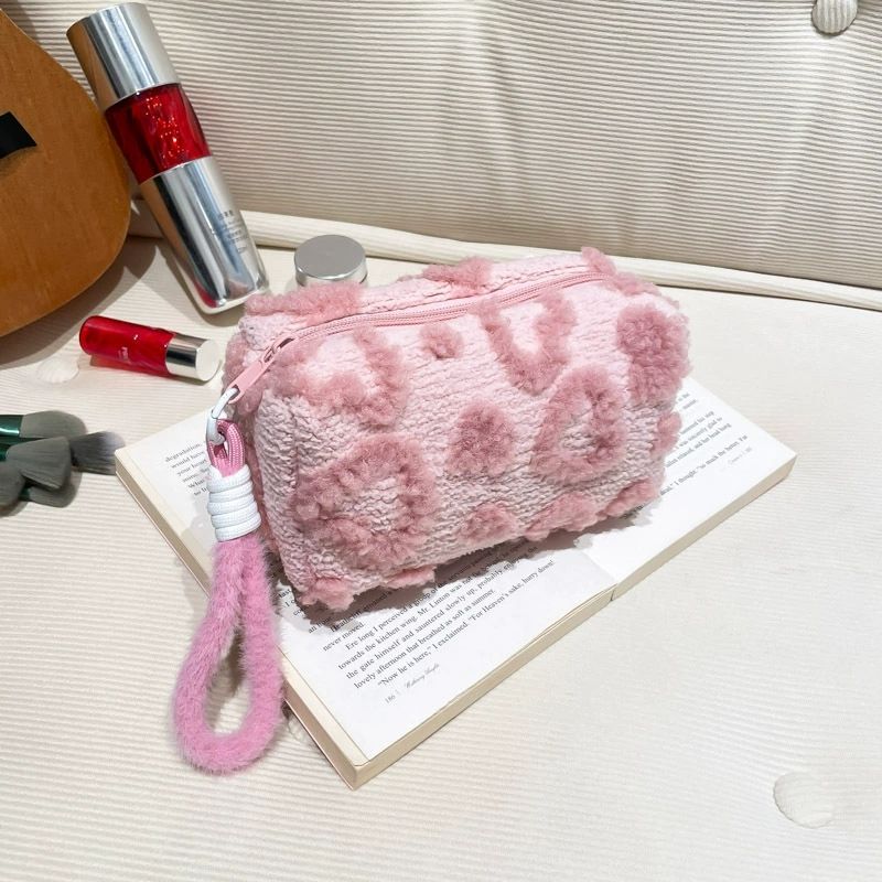 Plush Makeup Bags with Handle Soft Travel Cosmetic Storage Bag Portable Love Print Organizer Pencil Case Cute Clutch Pouch