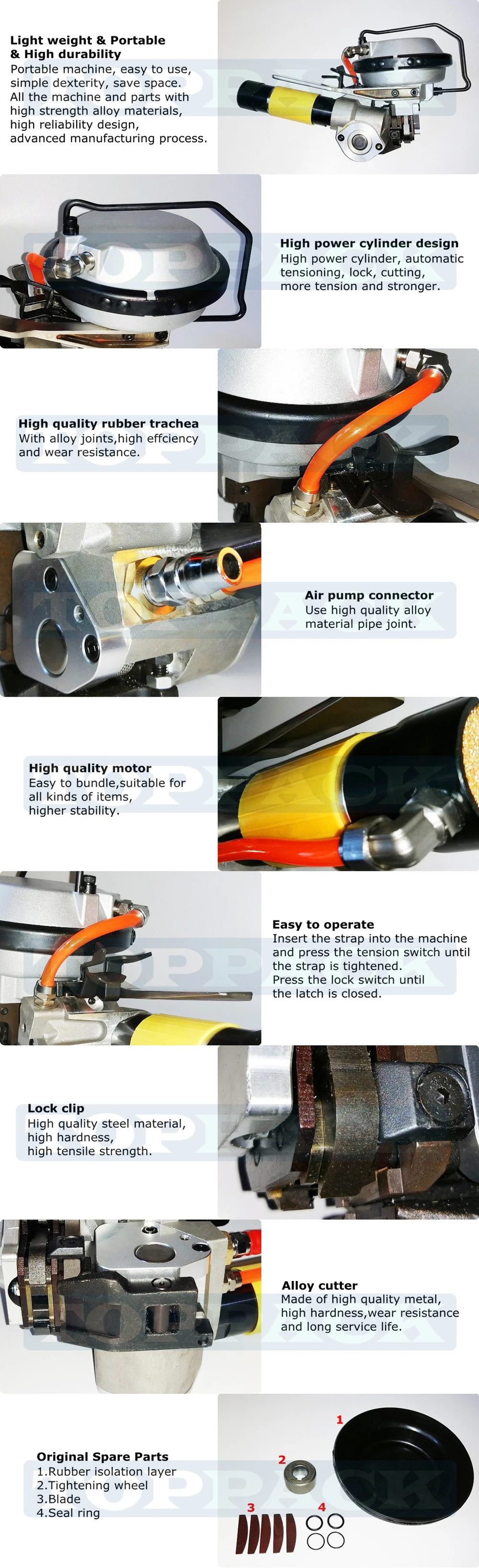 Simple, safe and reliable, packing quickly, solid, low labor intensity and improve working efficiency. There is only one operator will be able to complete the binding strip tightening, lock, shear, and all other actions.