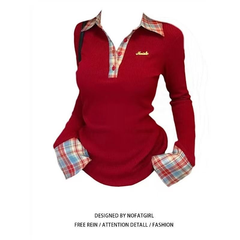 Polo Collar Long Sleeve Design Slim Fit Hot Girl Bottoming Shirt Red XL