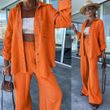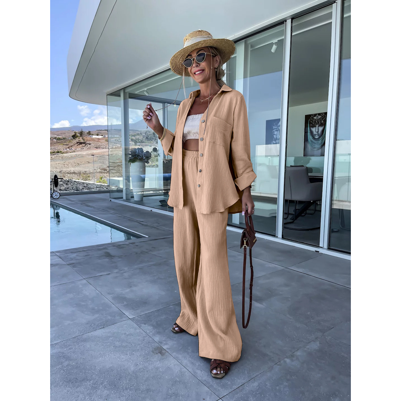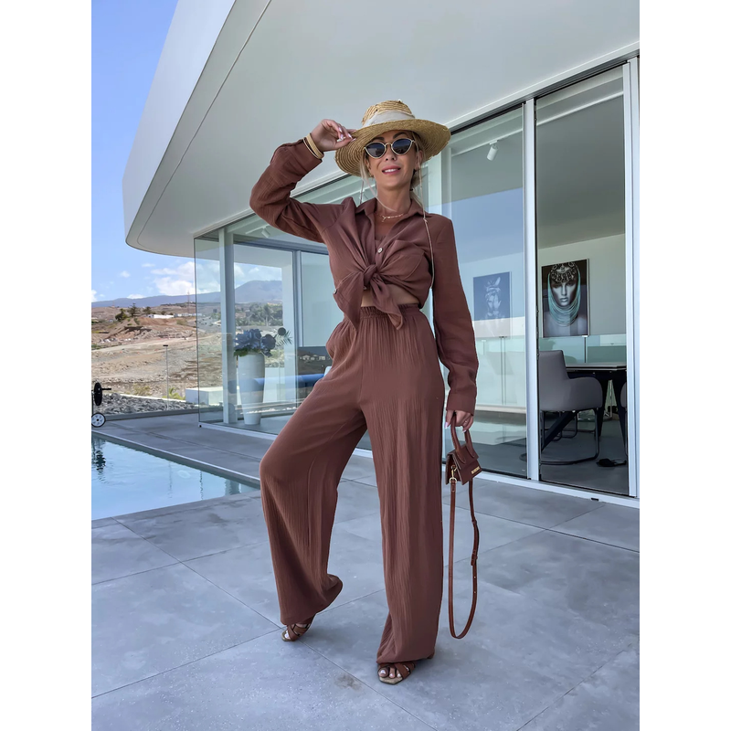 Polo Collar Long Sleeved Shirt Straight Pants Fashion Set Coffee XL