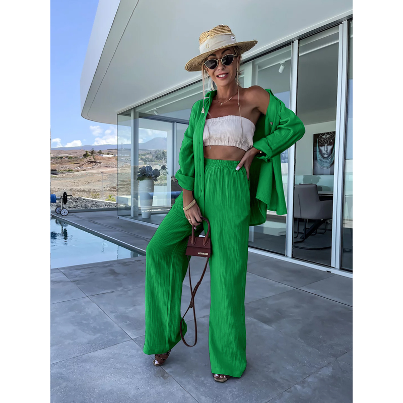 Polo Collar Long Sleeved Shirt Straight Pants Fashion Set Green L