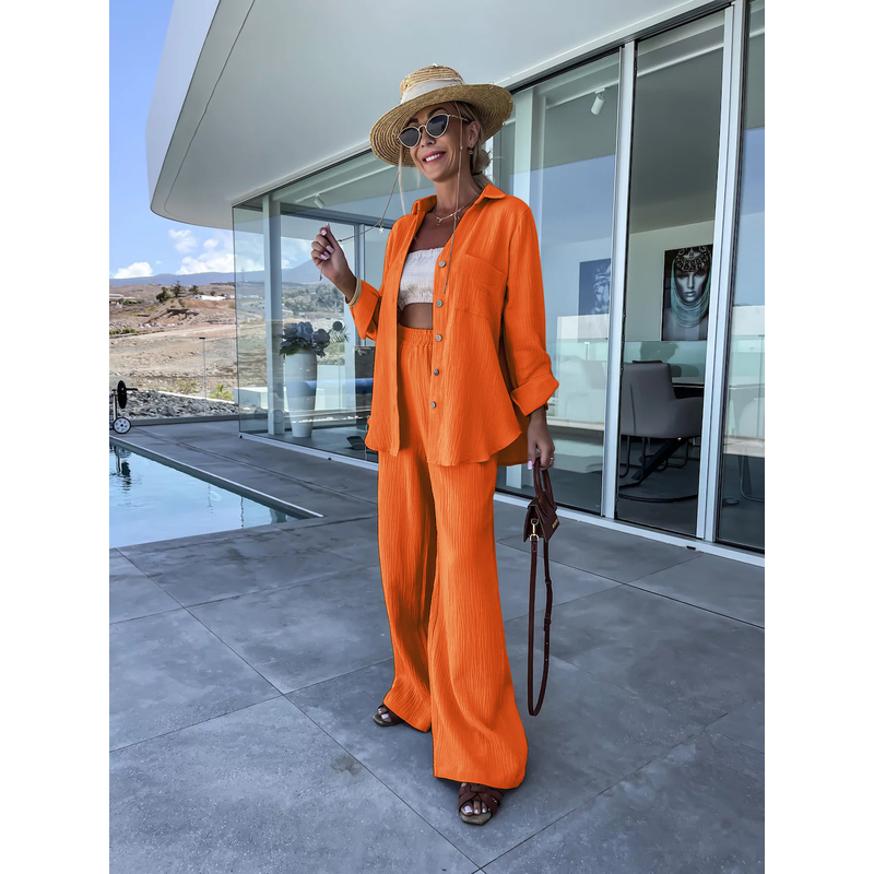Polo Collar Long Sleeved Shirt Straight Pants Fashion Set Orange XL