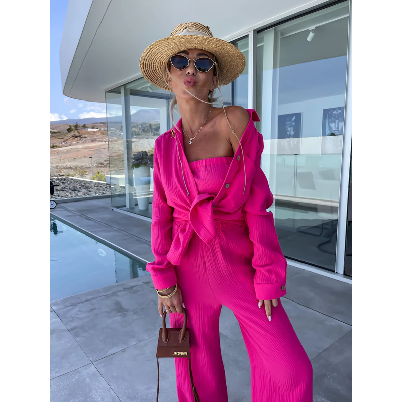 Polo Collar Long Sleeved Shirt Straight Pants Fashion Set Rose Red S