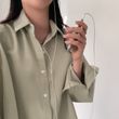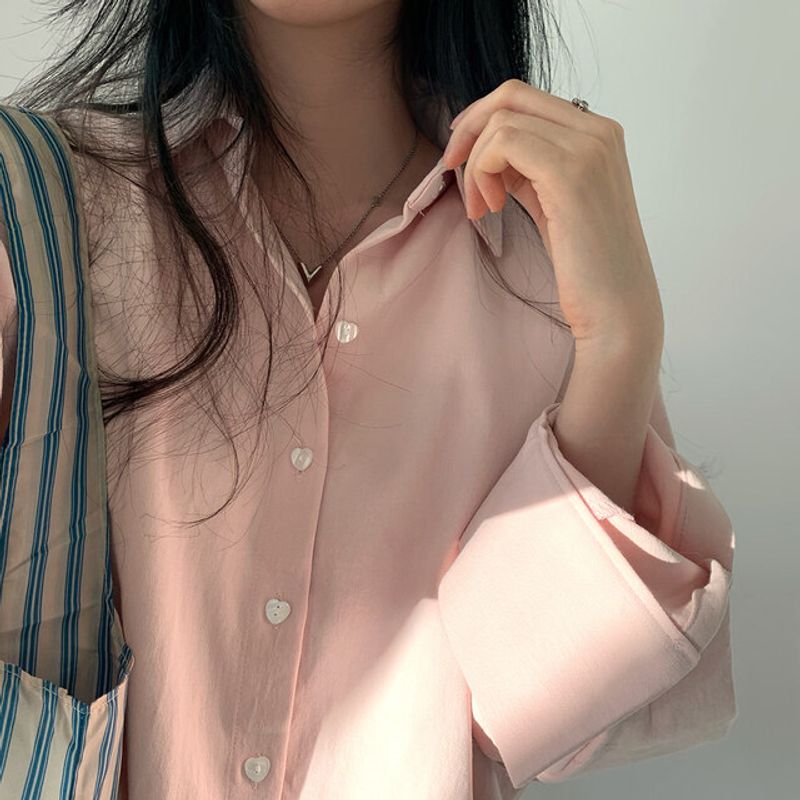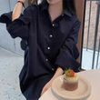 Polo Collar Single Row Button Loose Long Sleeve Long Shirt Navy Blue Free Size