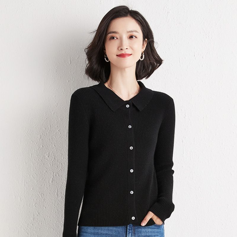 Polo Collar Slim Fit Slimming Long Sleeves Top Breasted Cardigan Black S