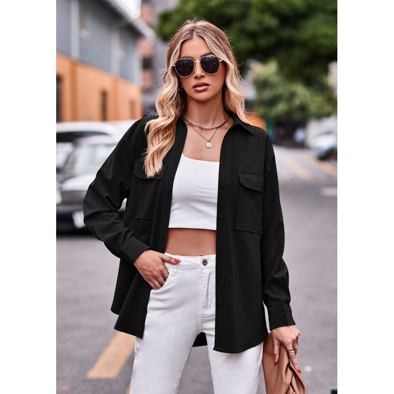 Polo Collar Solid Color Long Sleeve Coat Shirt Black S