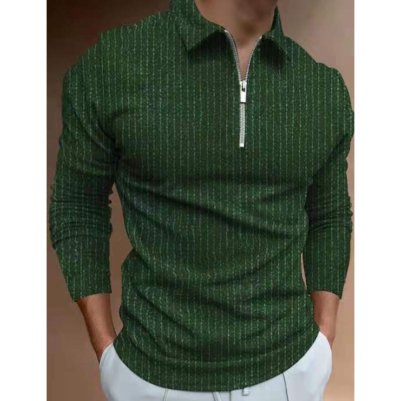 POLO Shirt Zipper Stripe Long Sleeve Men's T-shirt Top Green 3XL