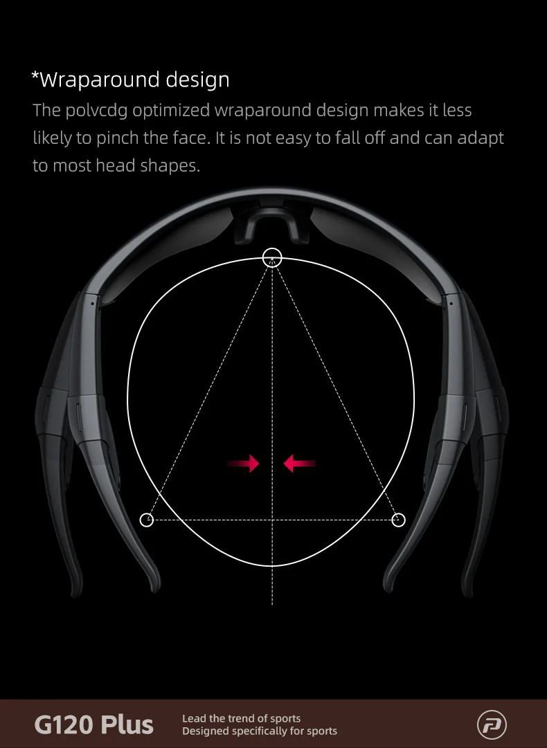 The physical anti-wind noise technology equipped on the Bluetooth glasses is based on the principles of aviation fluid dynamics and acoustic boundary layer control theory. It achieves stress-free riding through a three-dimensional curved surface diversion architecture. The temples made of silicone can avoid the ear-pinching sensation or pressure pain caused by traditional hard materials such as plastic or metal, making them suitable for long-term wearing.