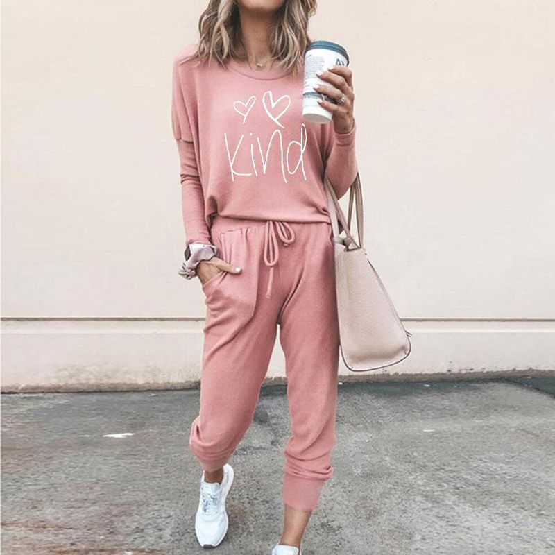 Popular Loose Print Long Sleeve Casual Suit Women Pink M