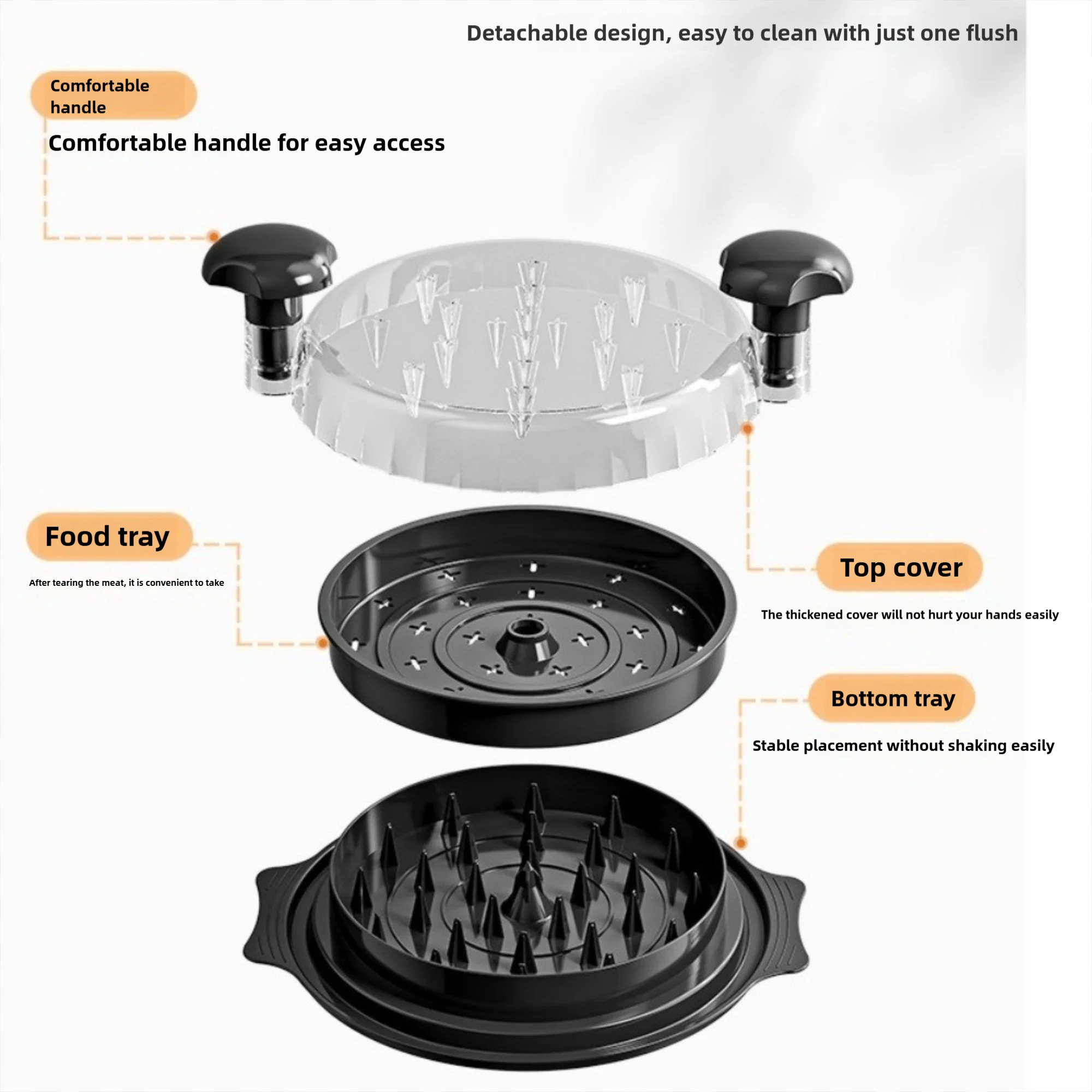 Use: This chicken chopper is a multifunctional tool for food chopper, before use, boil chicken, pork, beef and other meats with water until soft for easy chopping.
