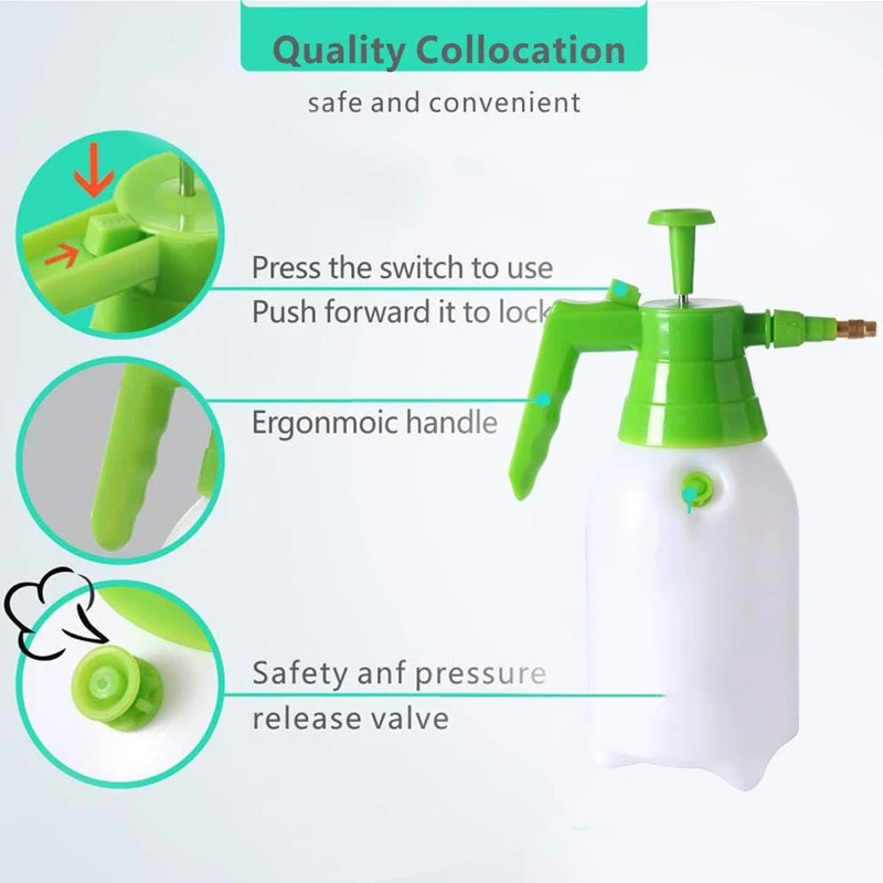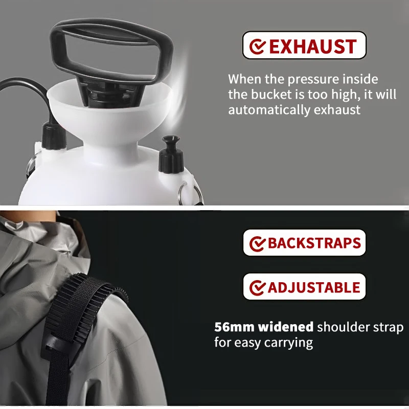 Safety & Convenience-The yard sprayer is made of high-quality PE material. This allows you to clearly see the liquid remaining capacity scale through the transparent bottle, allowing you to replenish the solution in time. This lawn sprayer is equipped with a safety valve that automatically relieves pressure when the pressure exceeds 2.5-3Bar.