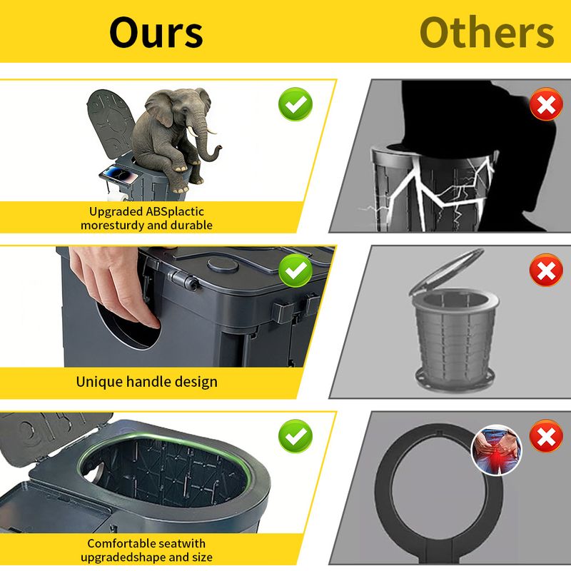 【Ergonomic Design】 Compared with the regular round seat, our portable loo for camping is specially designed with an ergonomic shape and a higher seat for your comfortable experience, widely suitable for both adults and kids.