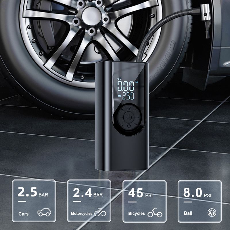 2. Precision with High-accuracy Intelligent Chip: Equipped with a high-accuracy intelligent chip, the electric air compressor provides precise pressure measurements, allowing for timely awareness of tyre conditions to ensure safe travels. Just set your desired pressure, and the device will automatically stop inflating once it's reached, preventing overinflation and ensuring reliability.