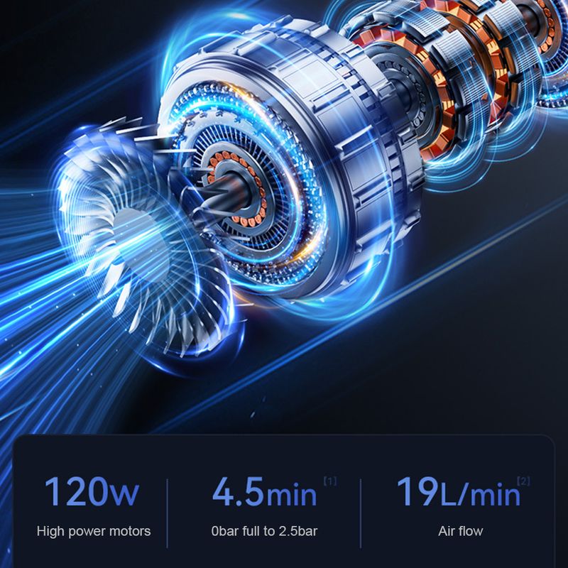 1. Rapid Inflation with Pure Copper Motor: The portable air compressor features airflow boosting technology powered by a pure copper motor, enabling a powerful and rapid inflation in just 10 seconds. This efficient mechanism significantly increases the inflation speed, ensuring you're back on the road in no time.