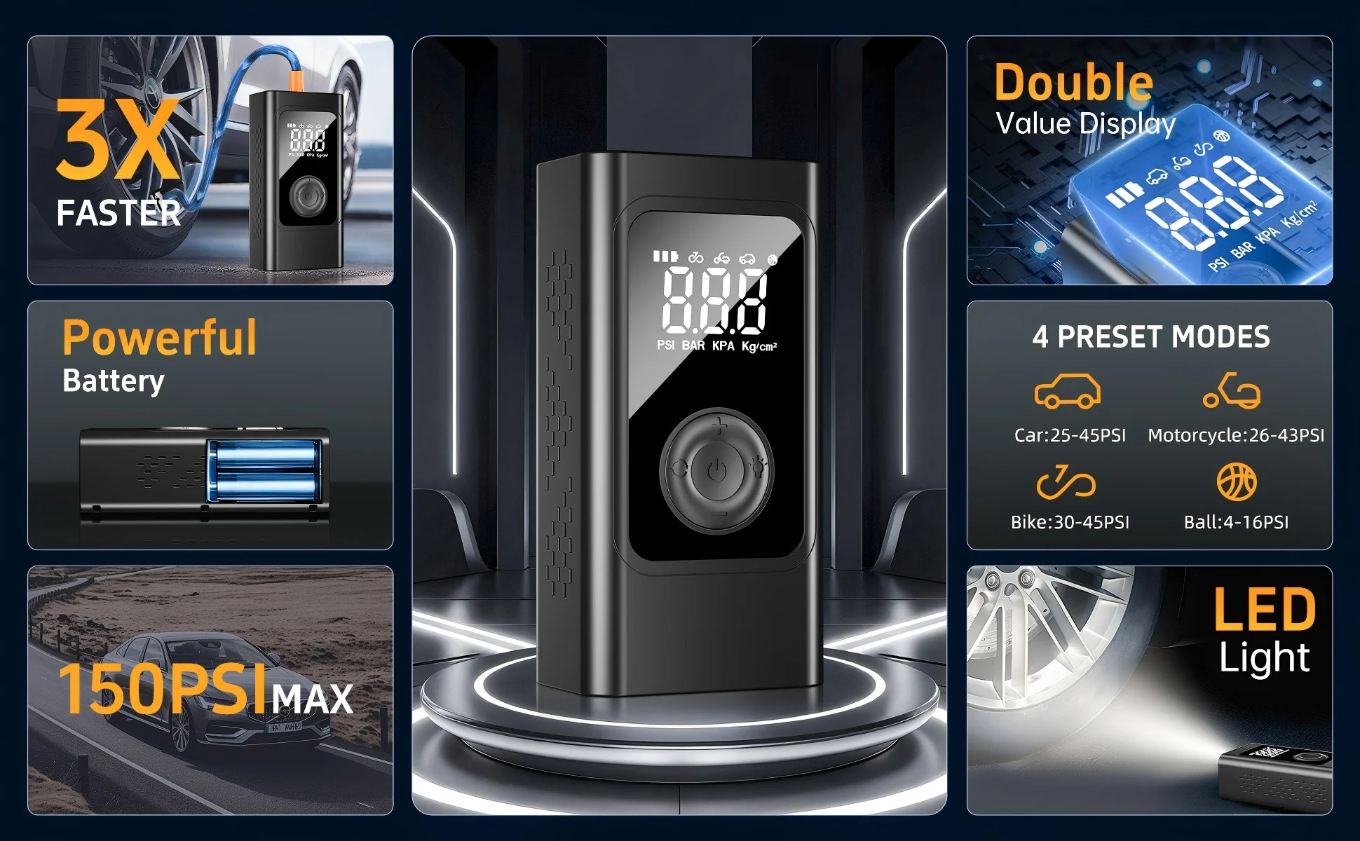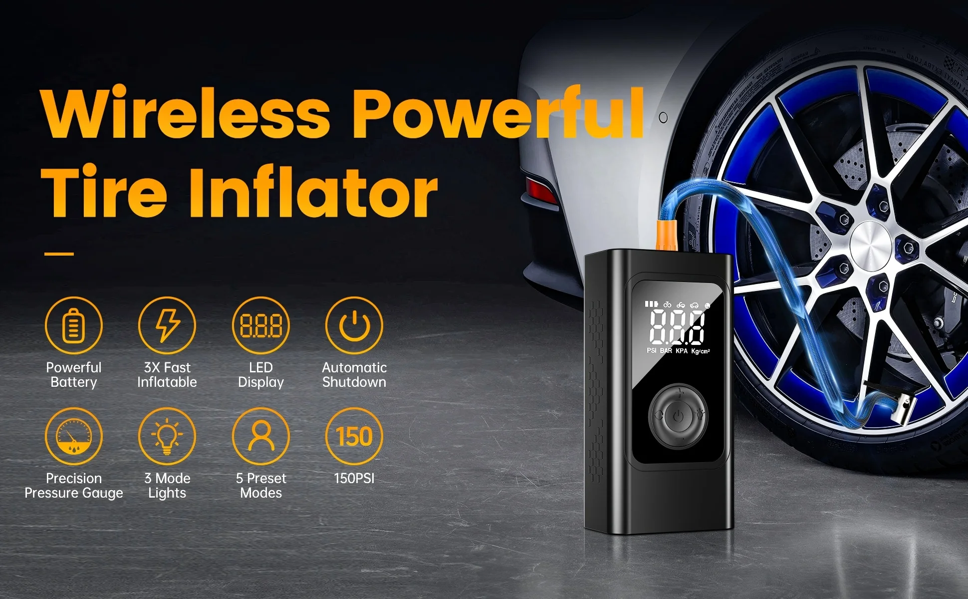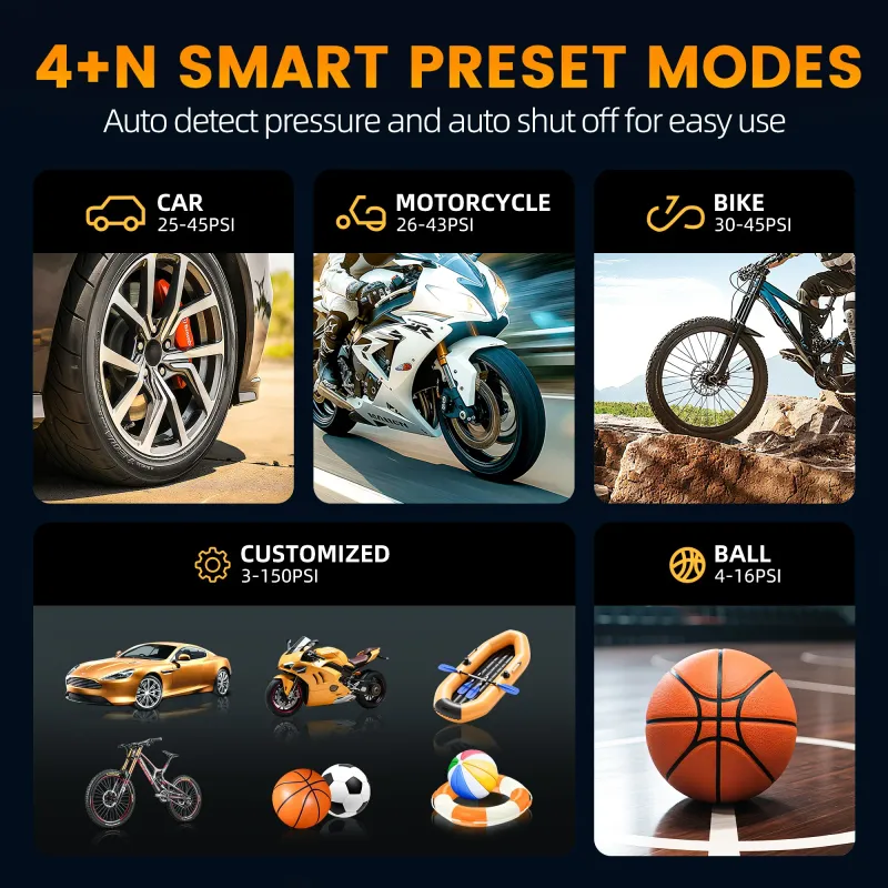 High Pressure Inflation: With a powerful 150PSI output, this electric tire inflator quickly fills your car, motorcycle, or bicycle tires to the optimal pressure for safe and efficient travel.