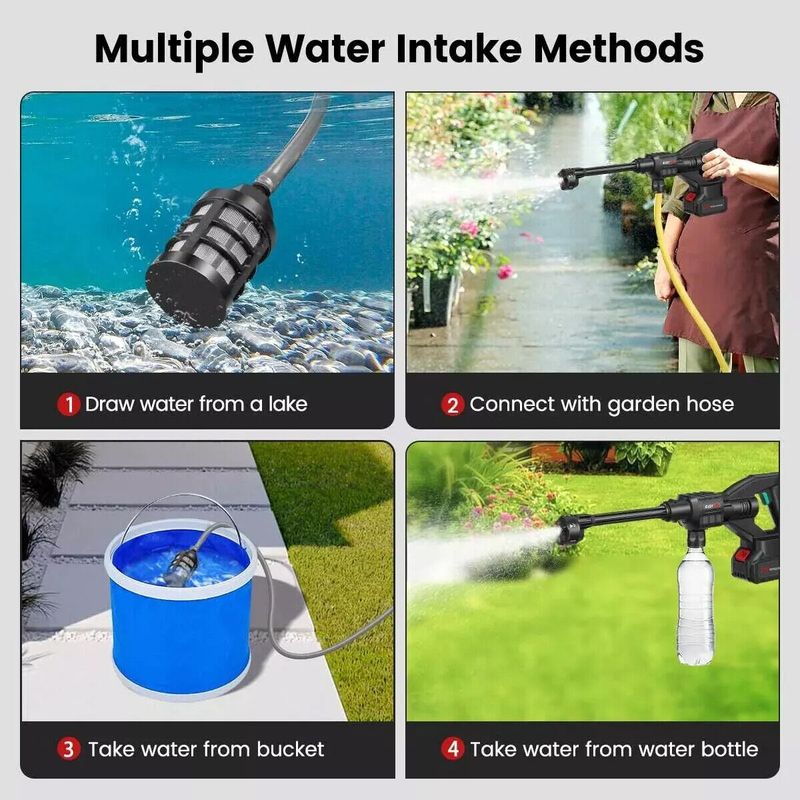 - When you travel outdoors, just put the water pipe into the rivulet,bucket or any water source to start washing your car.