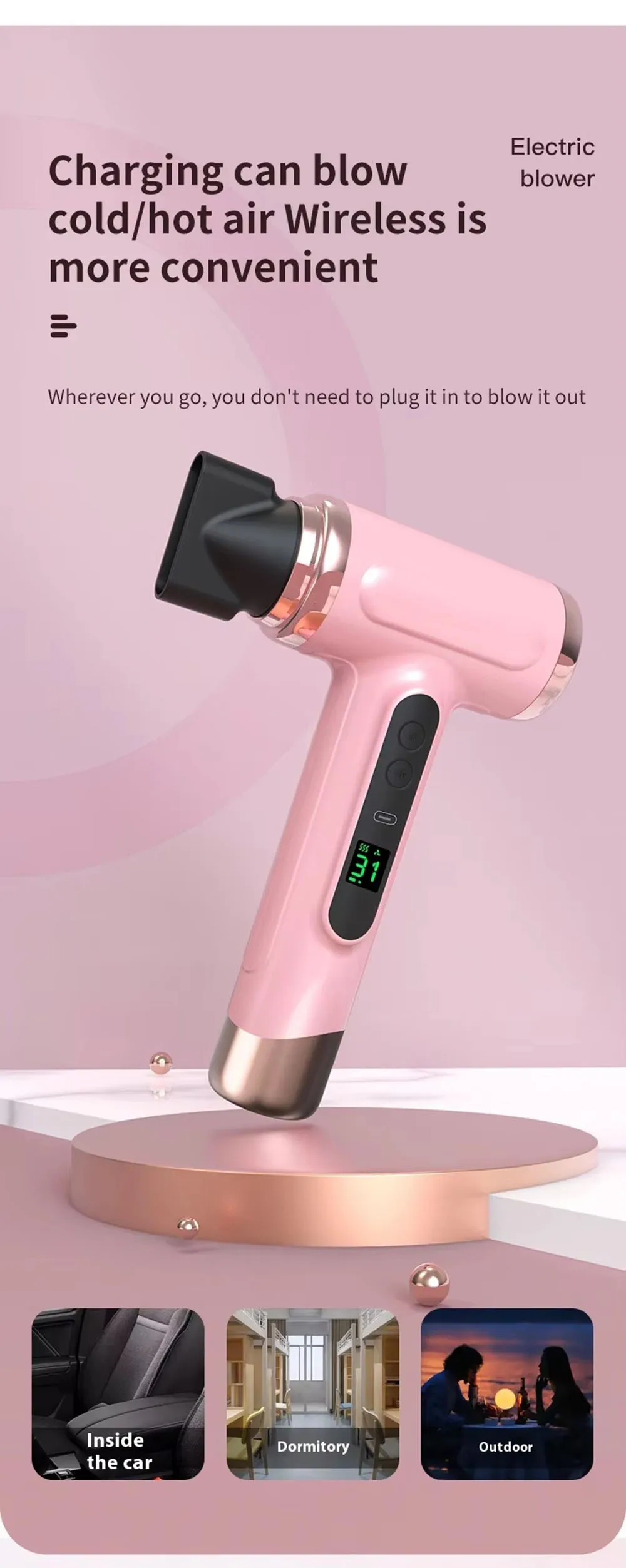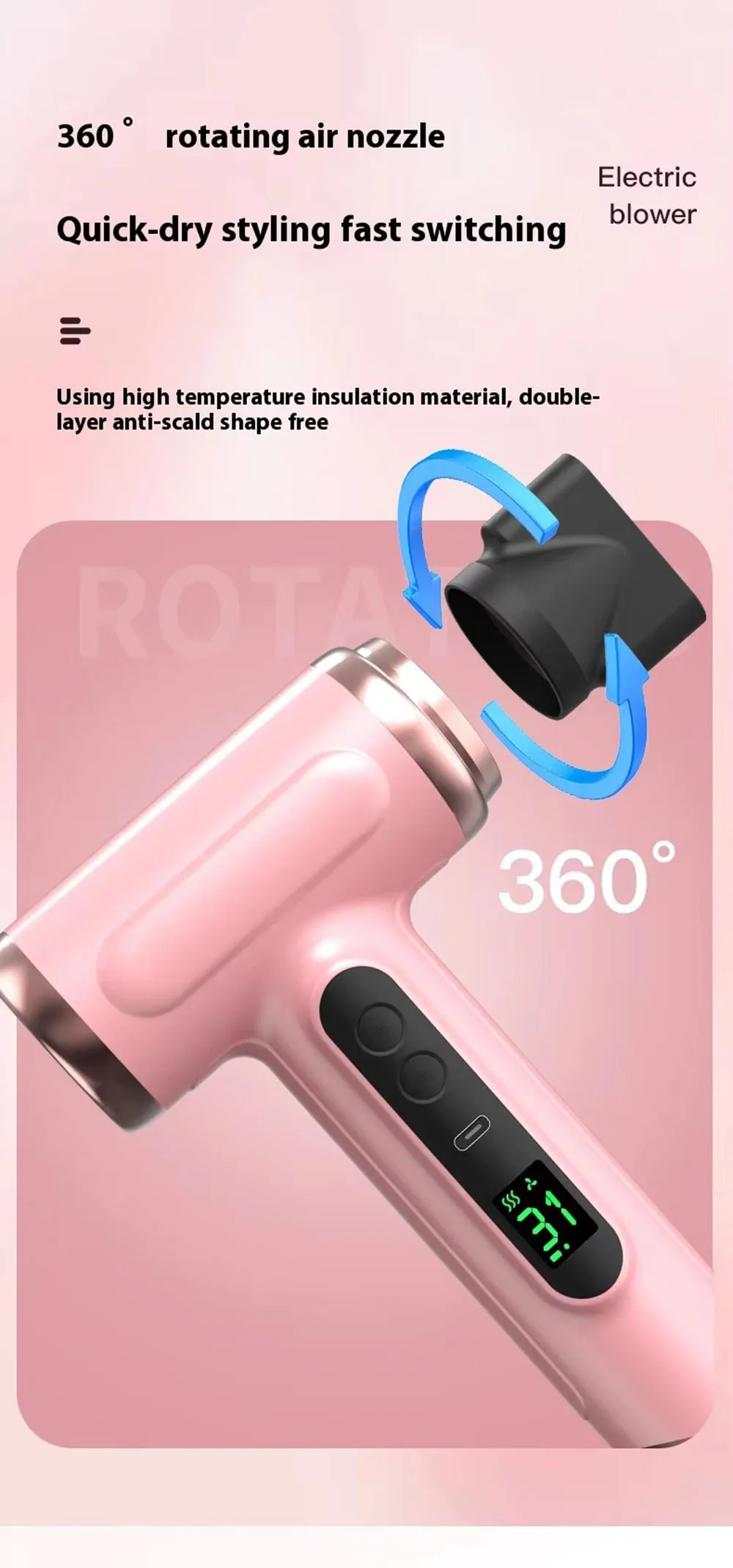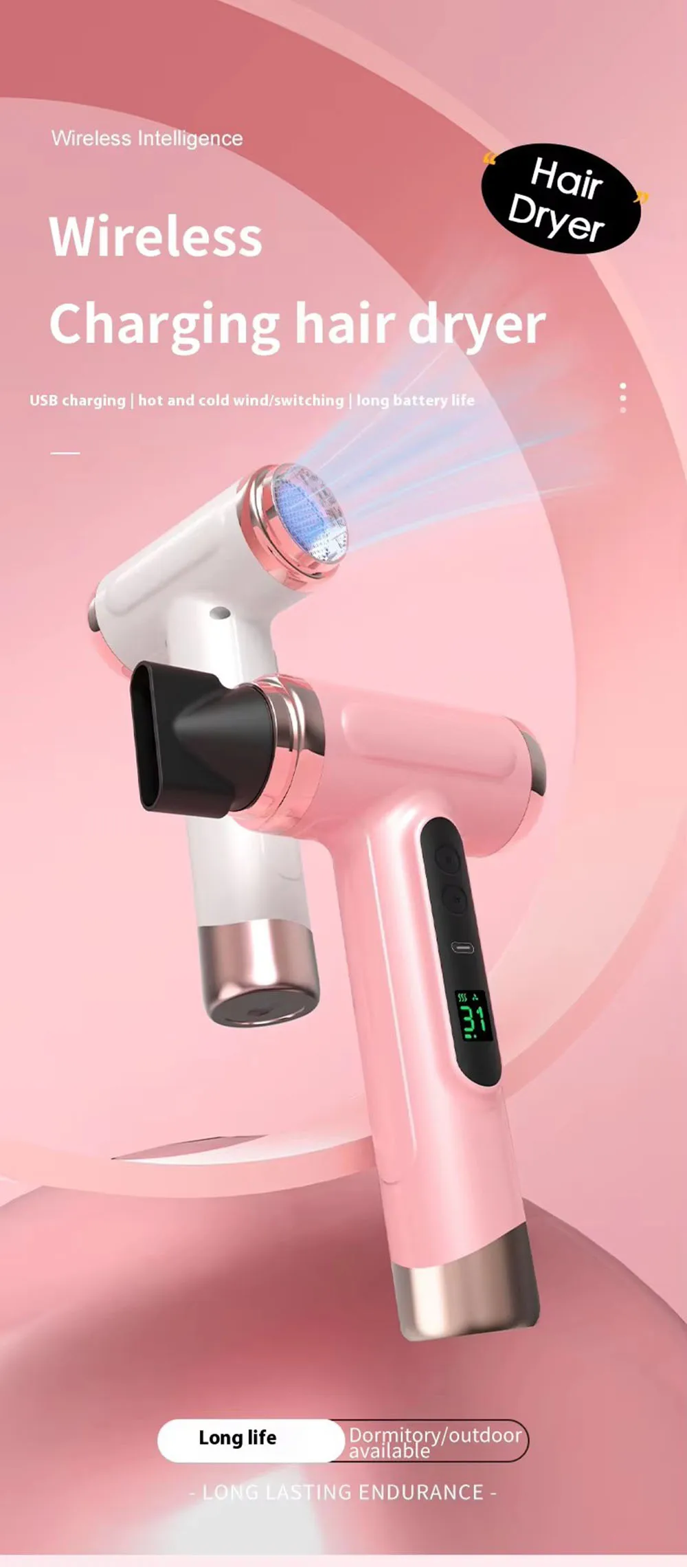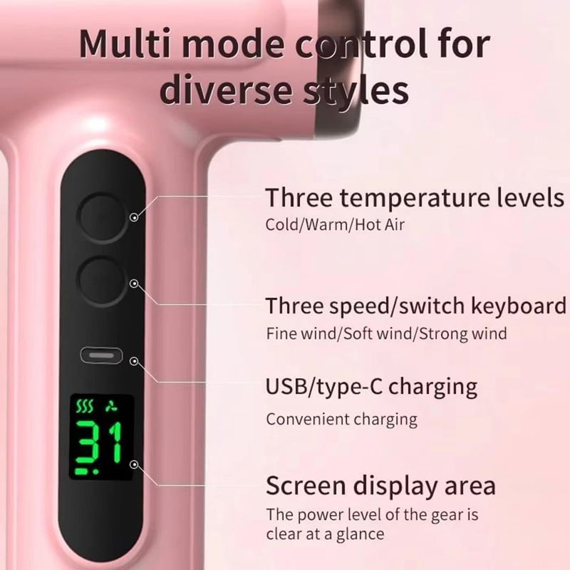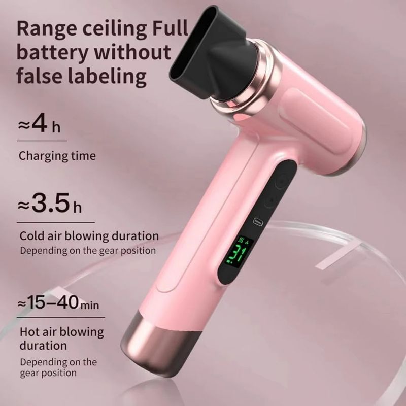 Portable Hair Dryer USB Charging Hot and Cold Air Hair Dryer Cordless Lightweight with Nozzle for Travel Student Dormitory