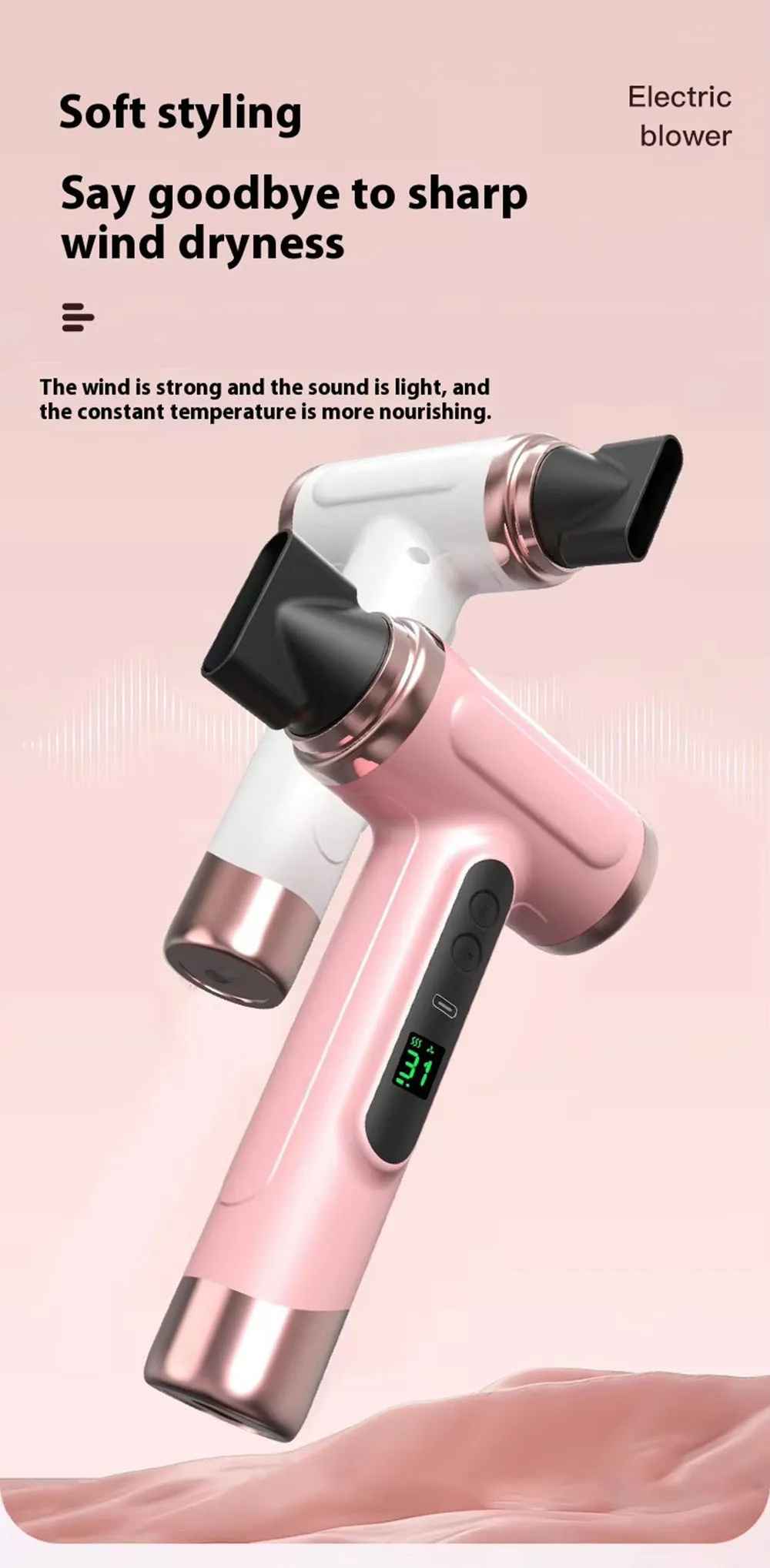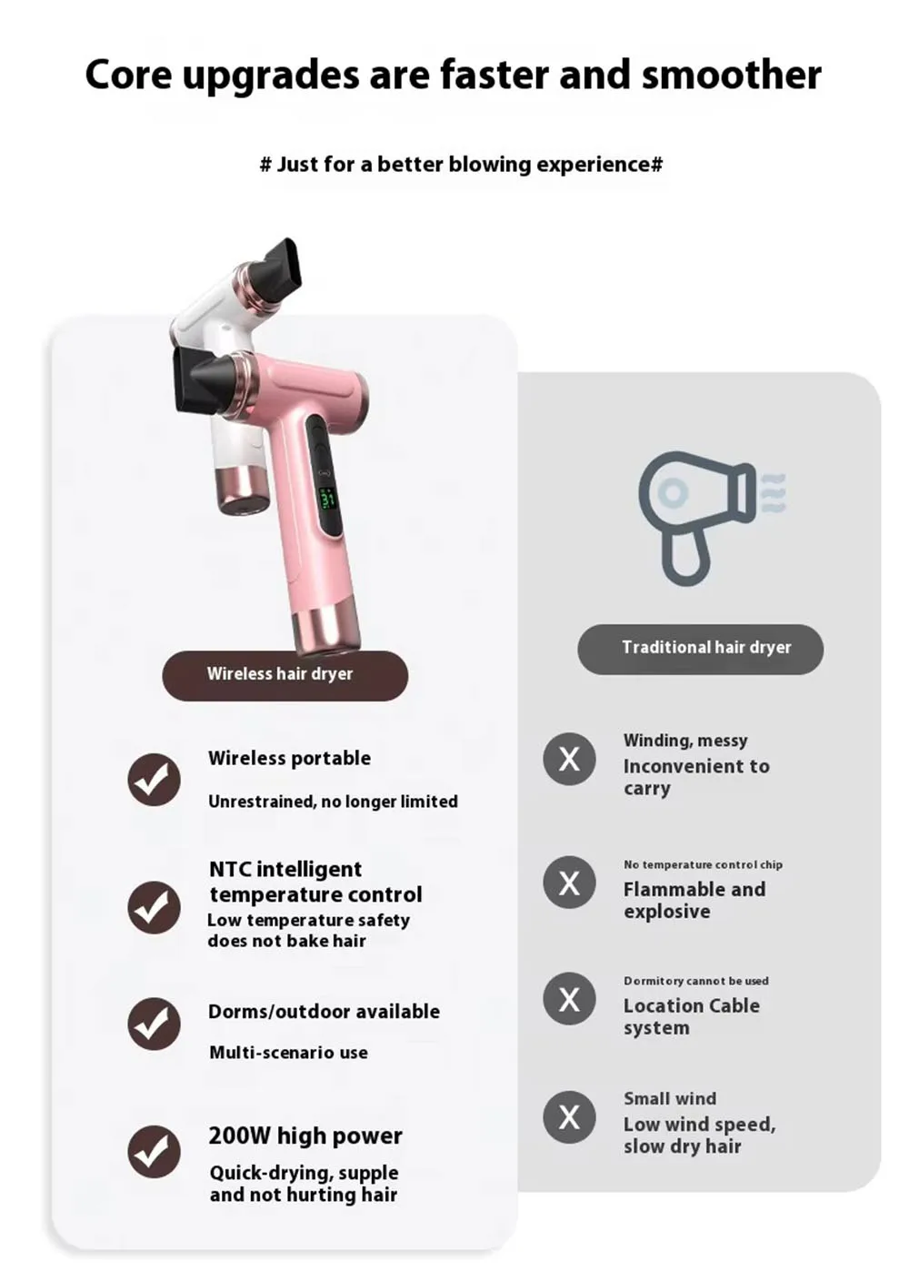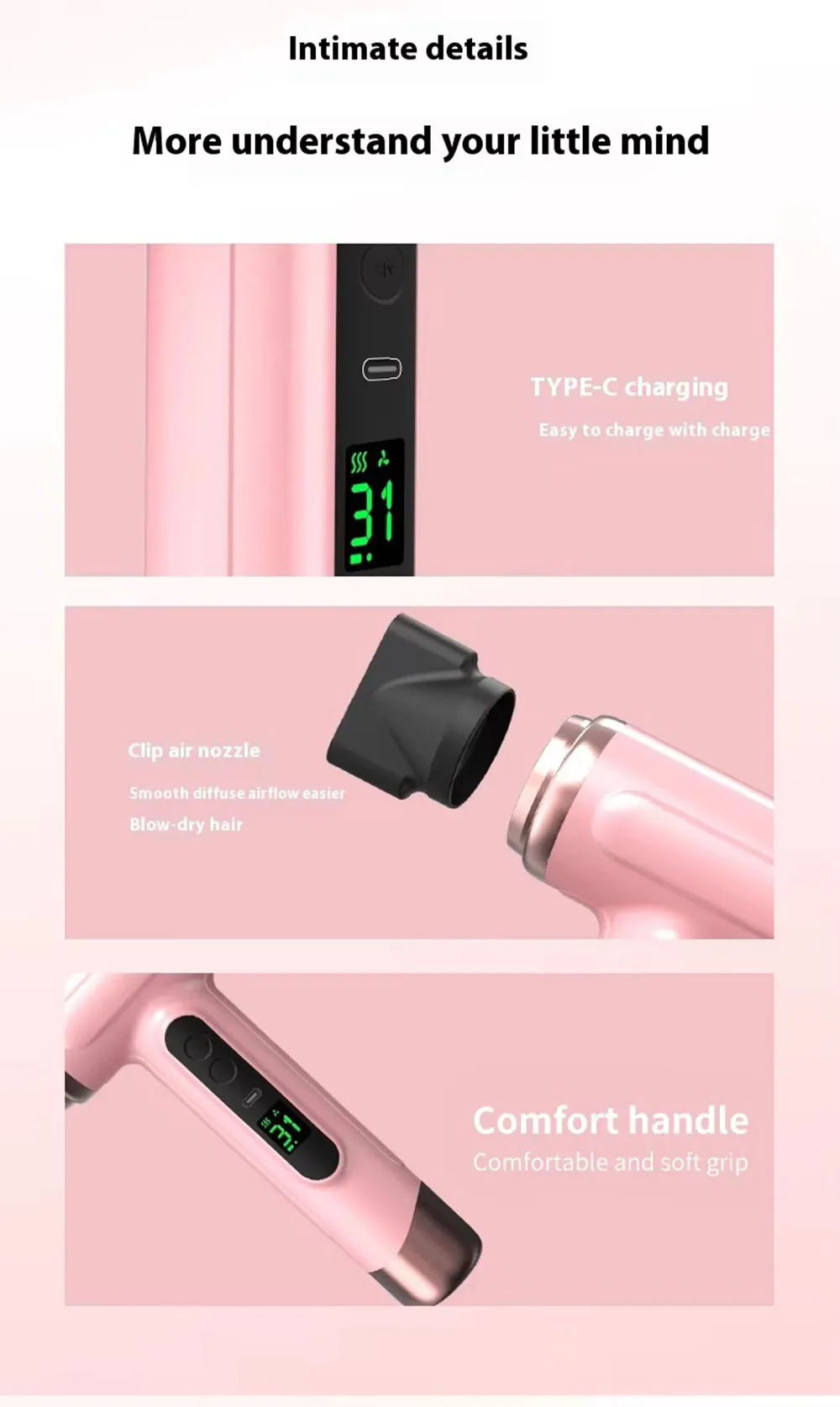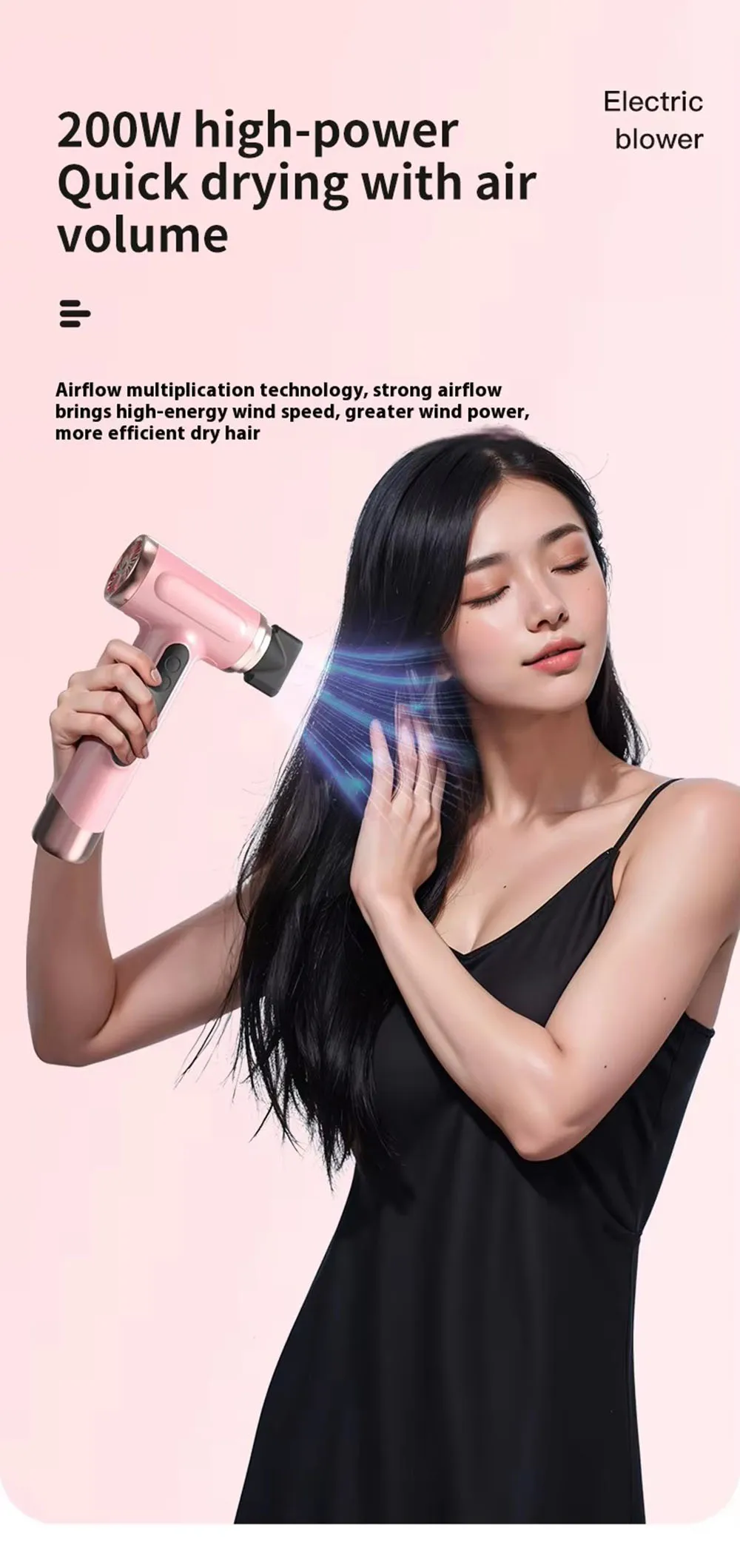 Portable Hair Dryer USB Charging Hot and Cold Air Hair Dryer Cordless Lightweight with Nozzle for Travel Student Dormitory