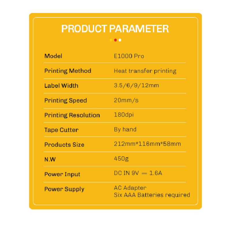 Standard set including: 1 printer + 1 12mm white label tape + 1 power cord + 1 instruction manual
