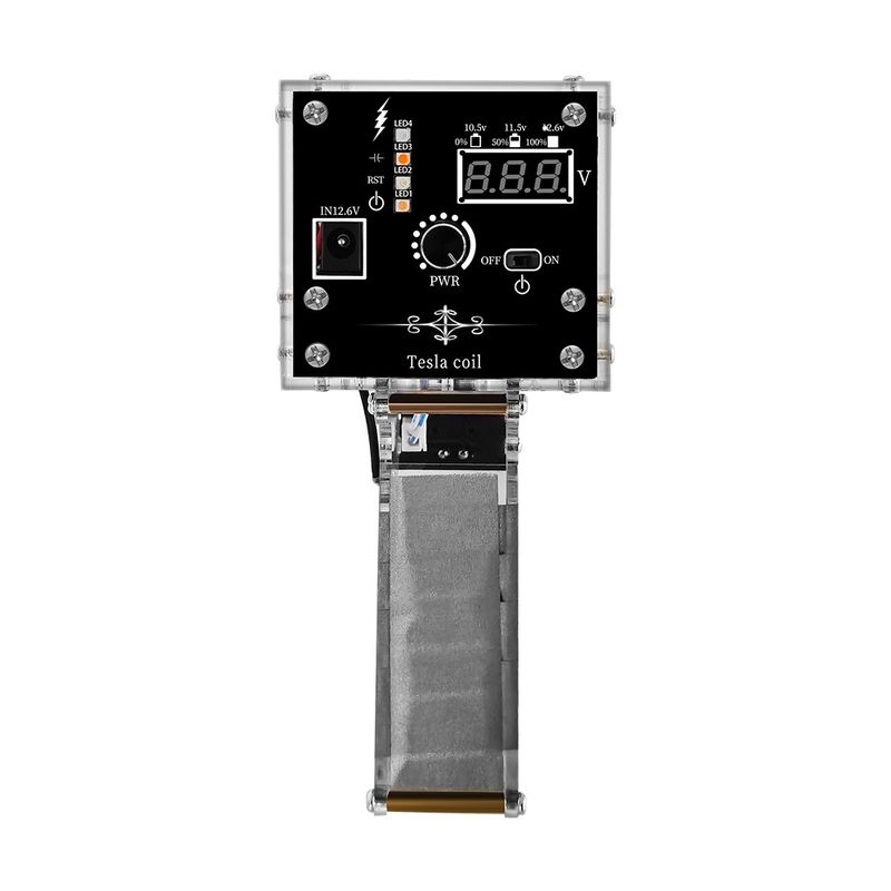 The hand-held Tesla coil is a portable portable portable artificial lightning generator. Its shell is made of fully transparent acrylic plate by hand; With a 12.6V Panasonic 2200mAh large-capacity lithium battery pack for power supply, it can generate more than 1700 beautiful artificial lightning flashes with a length of more than 13cm, which has a good performance in terms of effect and endurance. This product adopts the pull single trigger mode, and does not have the function of automatic trigger and music playback.