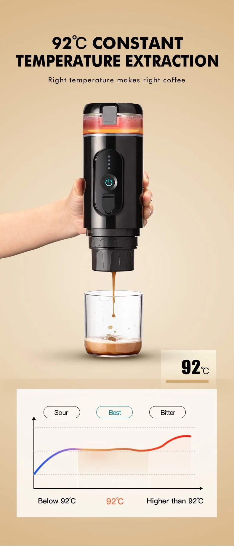 Operating system: Check the battery level, click the start button once, heat extraction mode: add cold water, quickly click the start button twice (boil water for 5 minutes). Long press the button to directly extract coffee using hot water.
