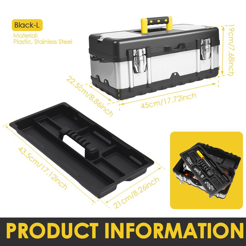 Sturdy Impact Resistant Construction : Made of plastic and stainless steel , the toolbox body is thickened and reinforced . It's pressure resistant , wear resistant and enduring , adapting to various usage environments such as home , car and construction sites