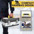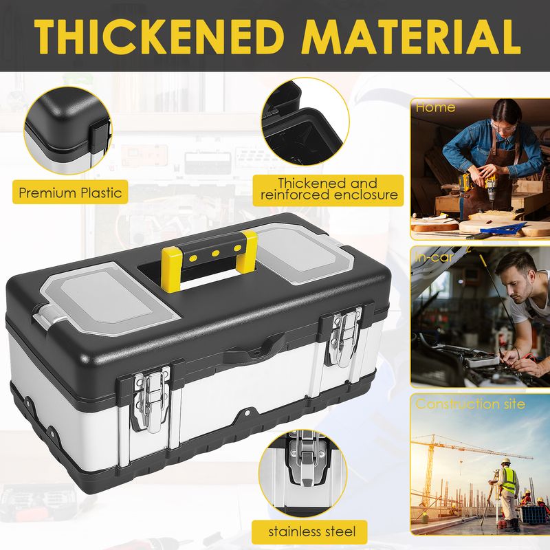 Sturdy Impact Resistant Construction : Made of plastic and stainless steel , the toolbox body is thickened and reinforced . It's pressure resistant , wear resistant and enduring , adapting to various usage environments such as home , car and construction sites