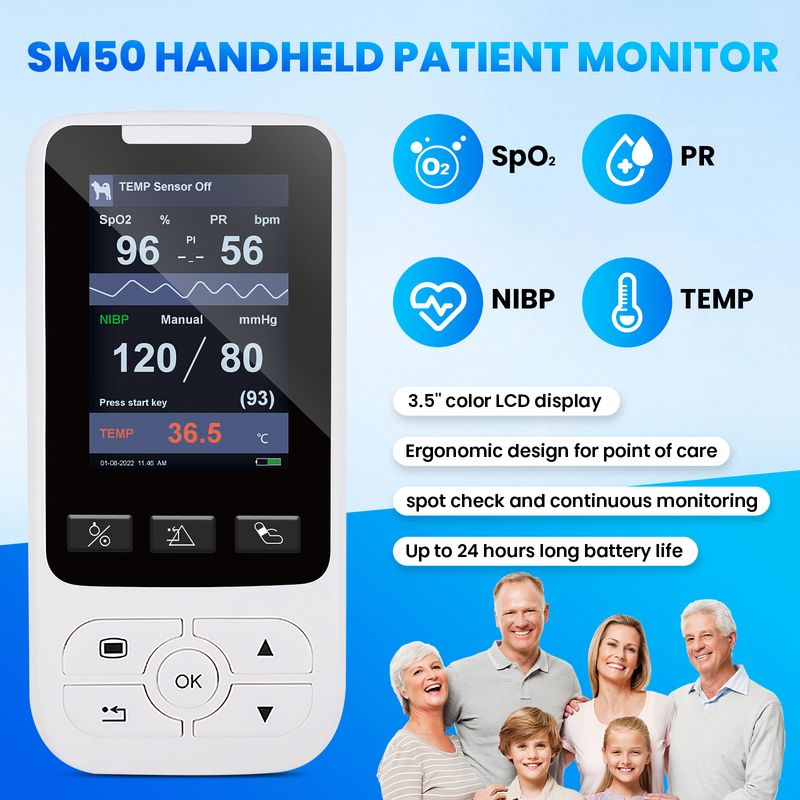 SM50 is a multi-functional hand-held patient monitor that can monitor SpO2, NIBP TEMP PR at the same time. the device is widely applicable to hospital wards, community clinics, Fimily and other medical institutions.