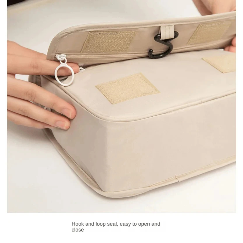 pocket2: Mesh pocket can be used to put cosmetics, cotton swabs and other small items pocket3: The main large pocket can be used for large and heavy toiletries pocket4: There are small pockets on the side of the main large pocket for flattening Flat items pocket5: There is also a small zipper pocket in front of the main big pocket, which can be used to store small items.