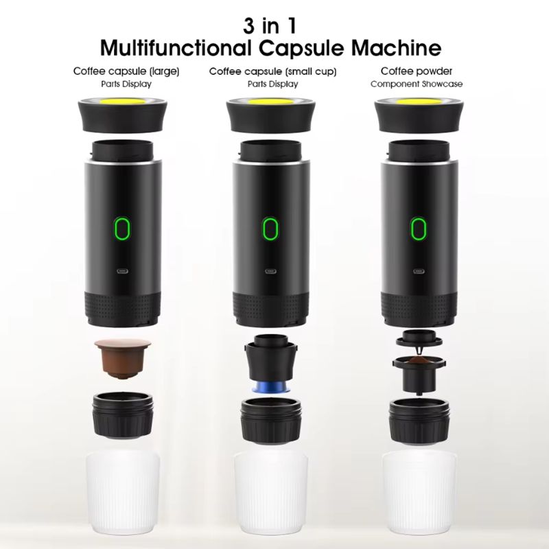 【Multi-compatible】The 3-in-1 portable espresso machine is equipped with a ground coffee compartment and a capsule compartment, which is compatible with small and large capsules and ground coffee.