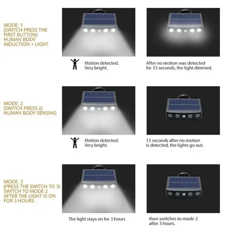 solar waterproof four-sided human body induction wall light switch front setting is easier to operate, and added indicator light display, energy saving and environmental protection, green lighting, long life, durability, low fault repair rate, high radiation stability, simple installation (only need 2 Screws can be fixed on the outdoor wall that can be sun-lit. It is easy to use, intelligent light-sensing control, no adjustment, energy-saving and convenient, making your home more beautiful and intelligent.