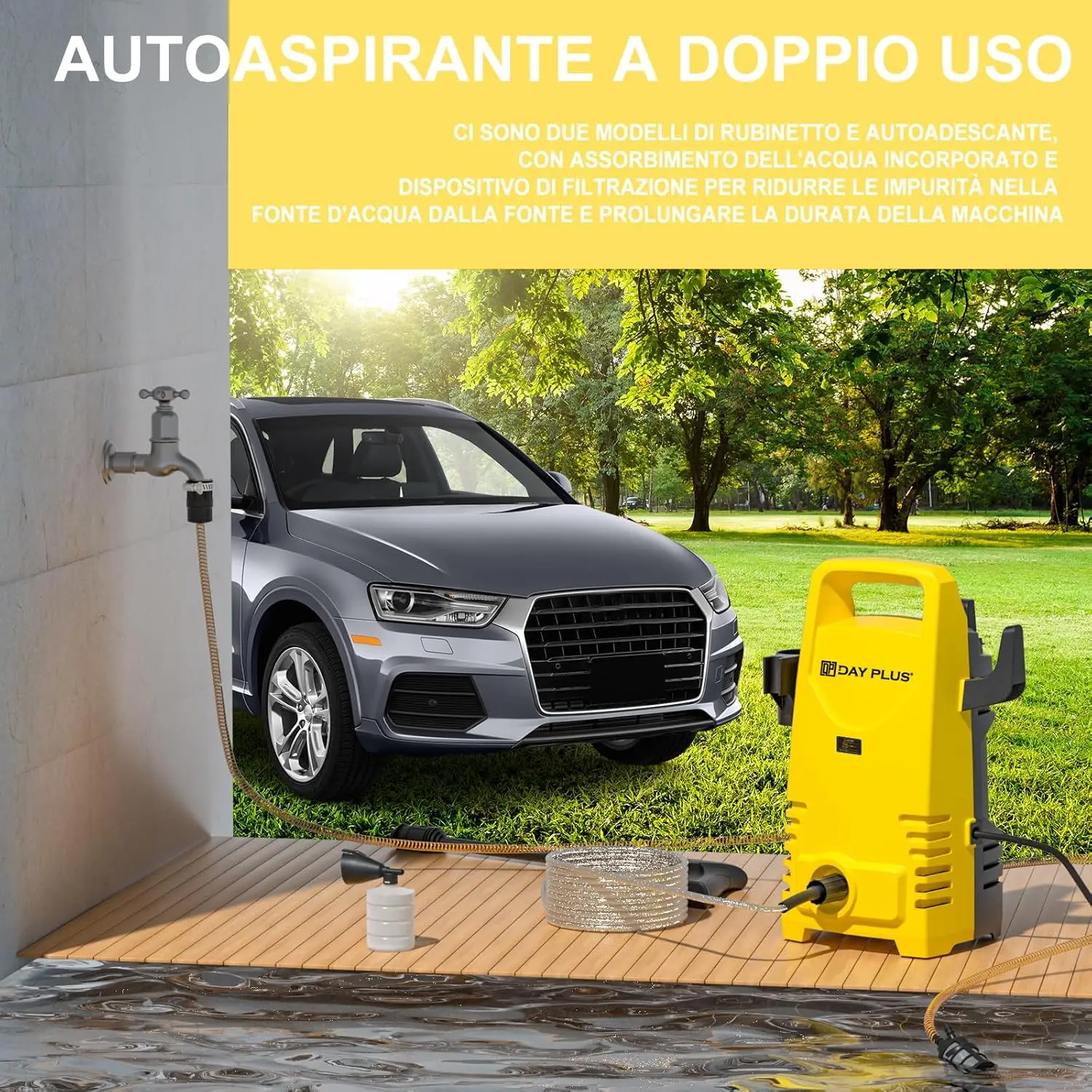 【Excellent Cleaning Performance】The portable pressure washer is equipped with a 1600W motor, with a pressure of up to 120 bar and a flow rate of up to 380 litres per hour. It can cover a larger area in a shorter time, ensuring effective removal of various stubborn dirt and grime, thus improving cleaning efficiency, making it an ideal choice for cleaning cars, patios and yards.