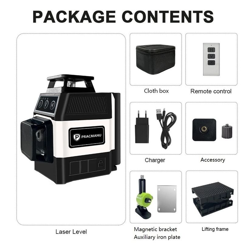 Pracmanu Mini Laser Level 12 Lines 3D level Self-Leveling 360° Horizontal and Vertical Cross Green Laser Beam Lines