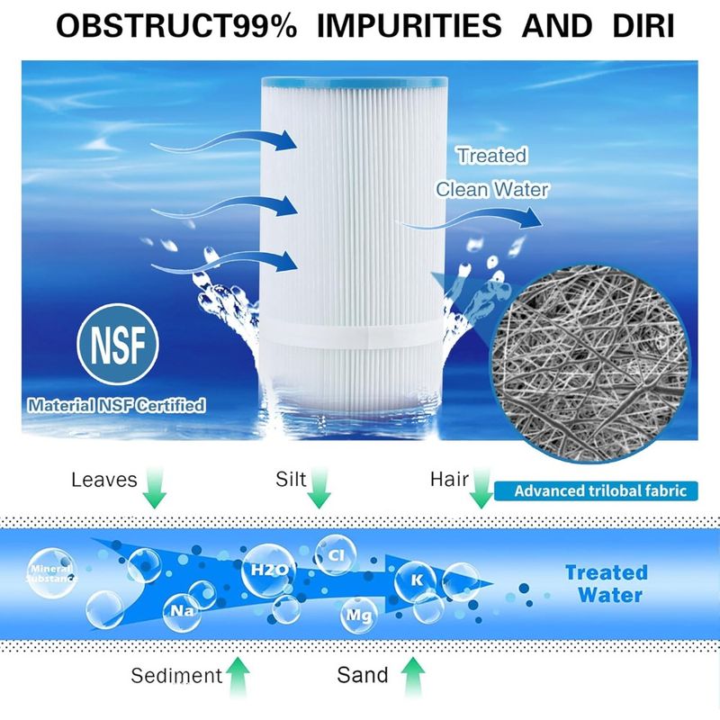 1. EASY TO CLEAN: This filter utilizes fabric structure design so as to make the impurities easy to be released and washed. It is recommended to wash the filters every 2-6 weeks in order to maximize the performance and capacity of it. In addition, Our premium filter material keeps your water clearer and easier to clean.