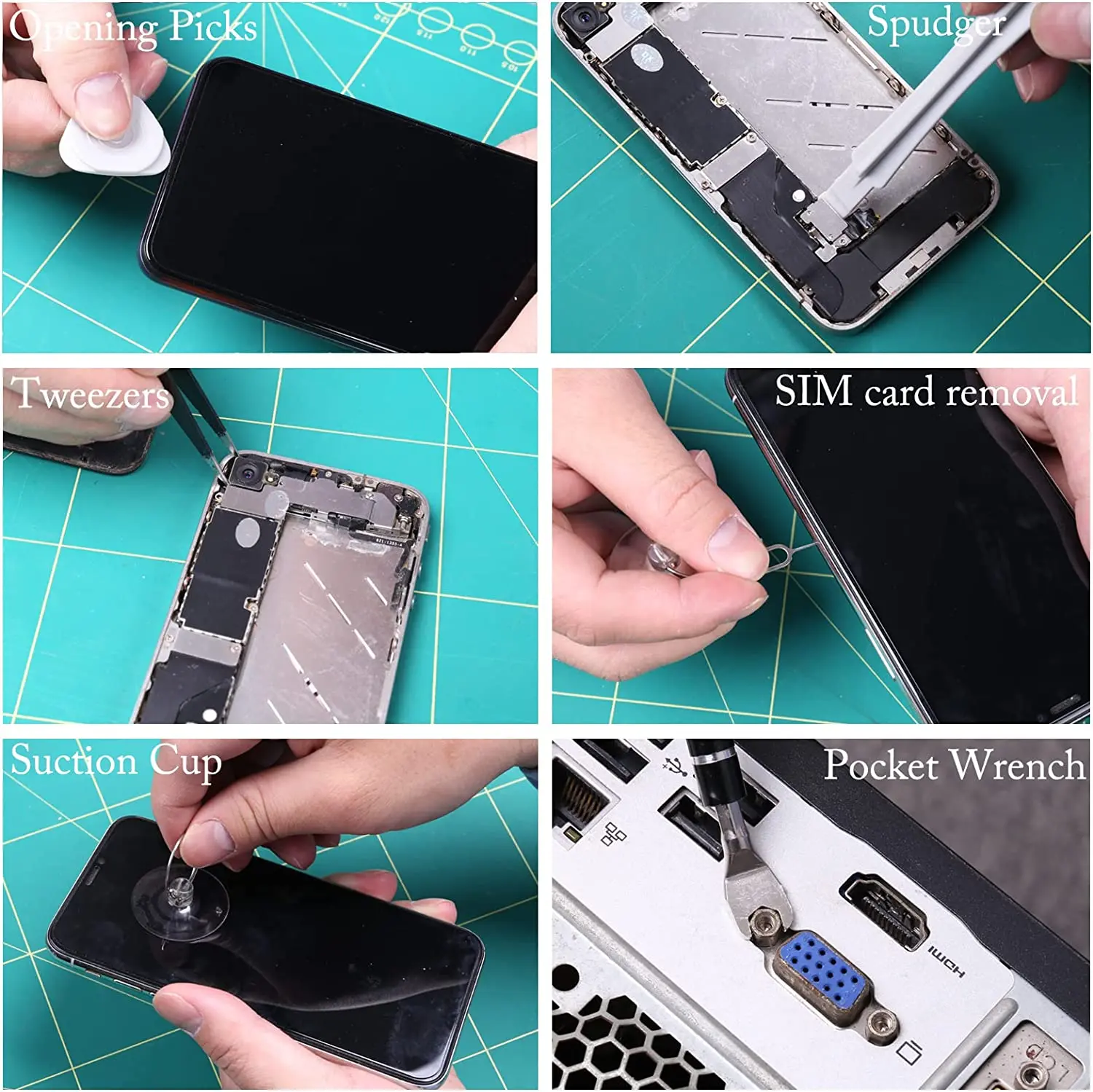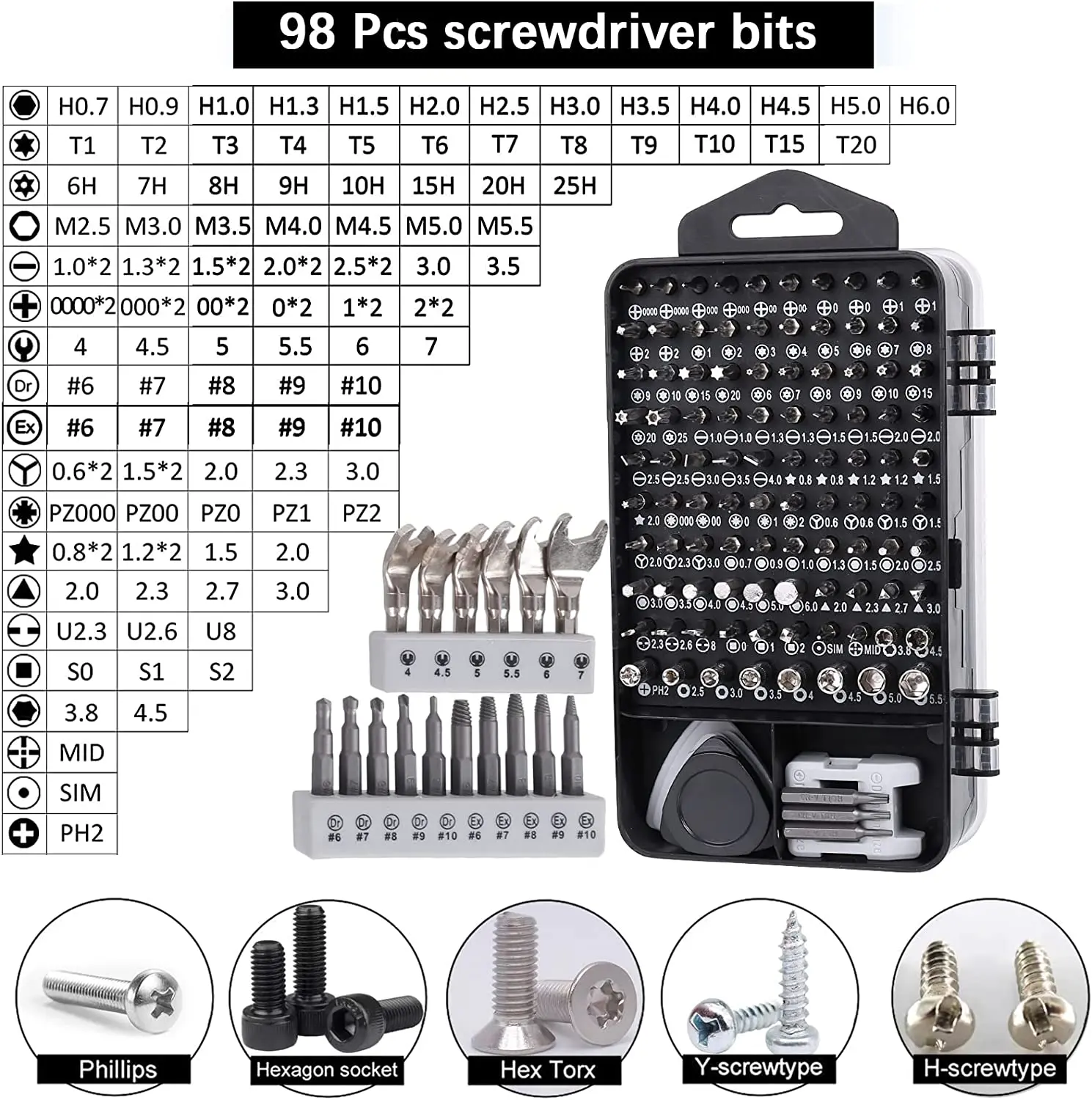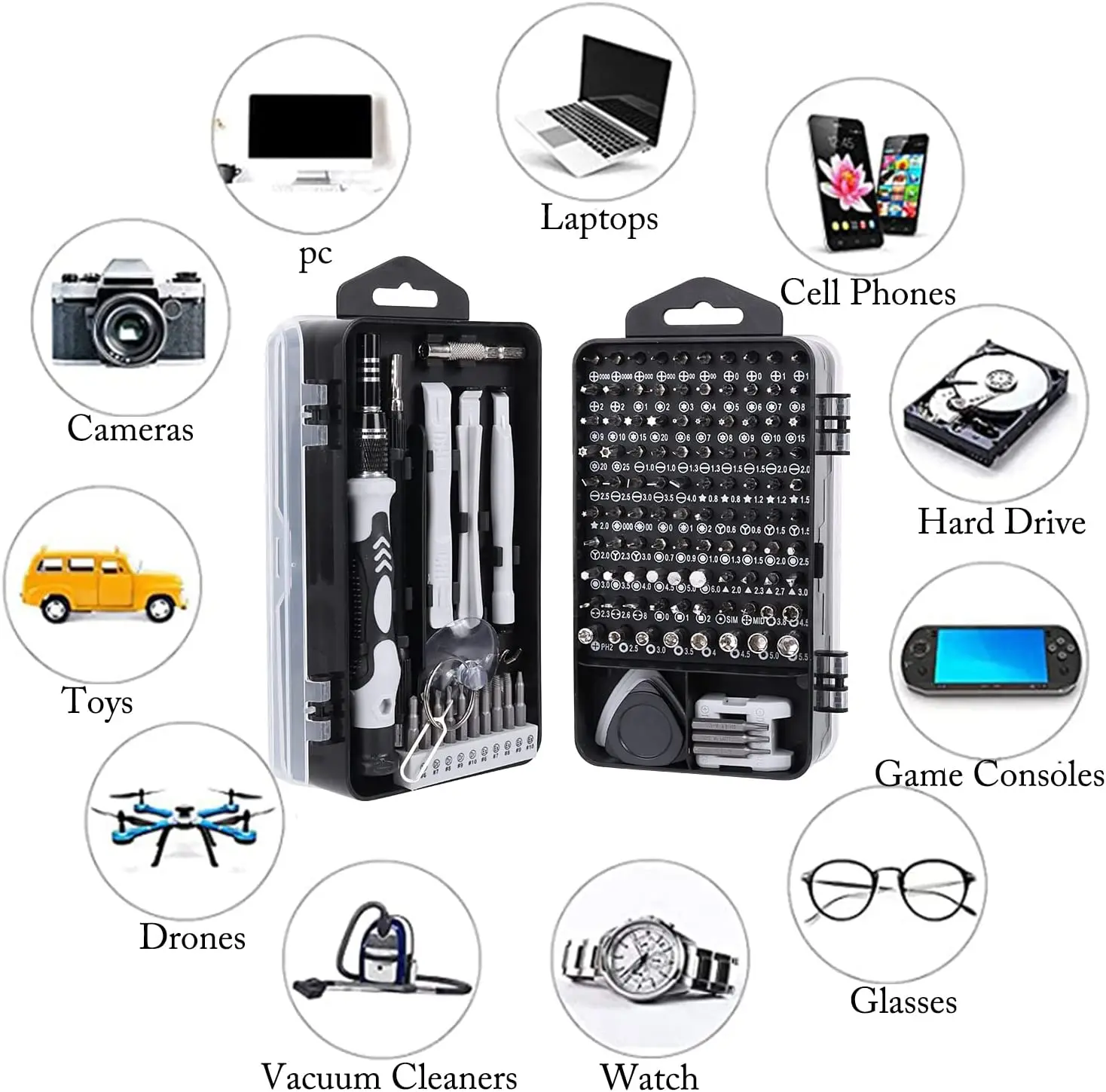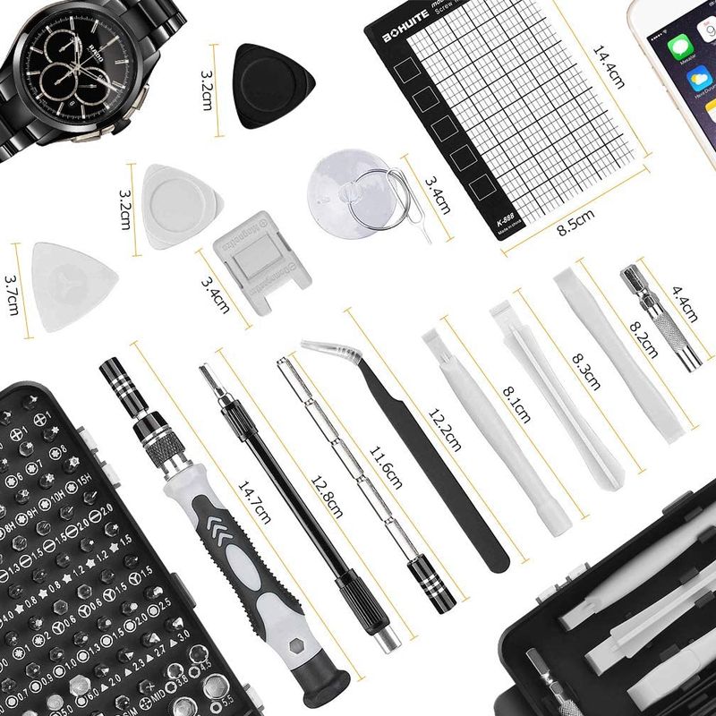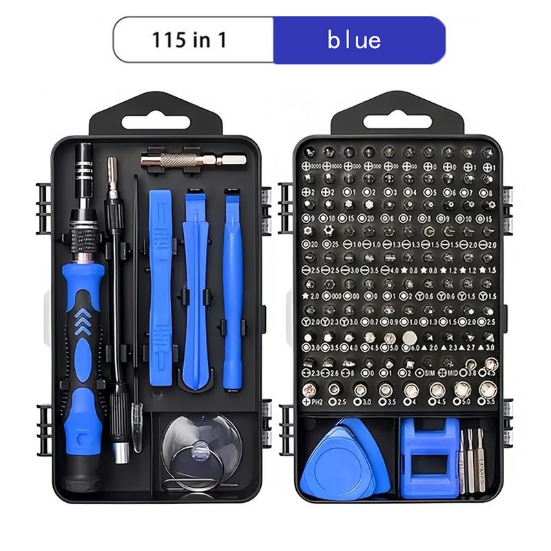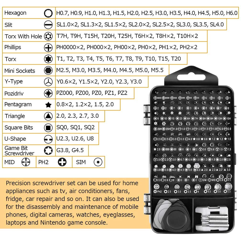 【115 in 1 Multifunction Screwdriver Kit】The 115 in 1 screwdriver set includes 98 screwdriver bits, 1 magnetized driver handle, 1 magnetizer/demagnetizer, 1 flexible extension shaft, 1 hard extension shaft,1 hexagonal sleeve socket for cordless drills, 1 anti-static tweezer, 3 plastic pry crowbars,4 ultra-thin & 4 normal triangle pry tools, 1 SIM card pin and 1 suction cup.