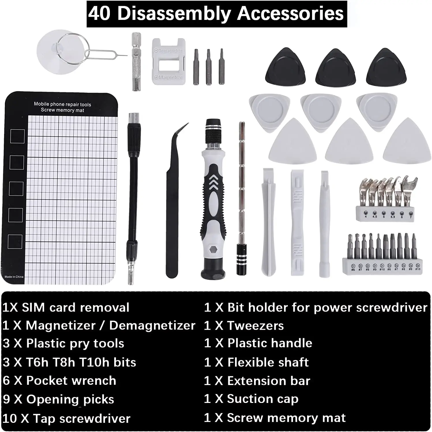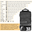 【122 in 1 Multifunction Screwdriver Kit】The 122 in 1 screwdriver set includes 98 screwdriver bits, 3TorxTR screwdriver bits, 1 magnetized driver handle, 1 magnetizer/demagnetizer, 1 flexible extension shaft, 1 hard extension shaft,1 hexagonal sleeve socket for cordless drills, 1 anti-static tweezer, 3 plastic pry crowbars,3 ultra-thin & 6 normal triangle pry tools, 1 micro screw magnetic pad, 1 SIM card pin and 1 suction cup.