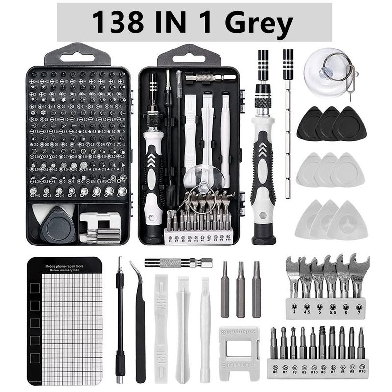 【138 in 1 Multifunction Screwdriver Kit】The 138 in 1 screwdriver set, 117 precision screwdriver bits, including 10 Damaged Screw Extractor Set,6 mini wrenches.21 practical accessories in the repair box,For example,1 magnetized driver handle, 1 magnetizer/demagnetizer, 1 flexible extension shaft, 1 hard extension shaft,1 hexagonal sleeve socket for cordless drills, 1 anti-static tweezer, 3 plastic pry crowbars,3 ultra-thin & 6 normal triangle pry tools, 1 micro screw magnetic pad, 1 SIM card pin and 1 suction cup