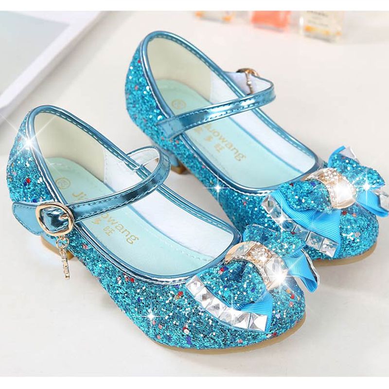 Princess Kids Leather Shoes for Girls Flower Casual Glitter Children High Heel Girls Shoes Butterfly Knot Blue Pink Silver
