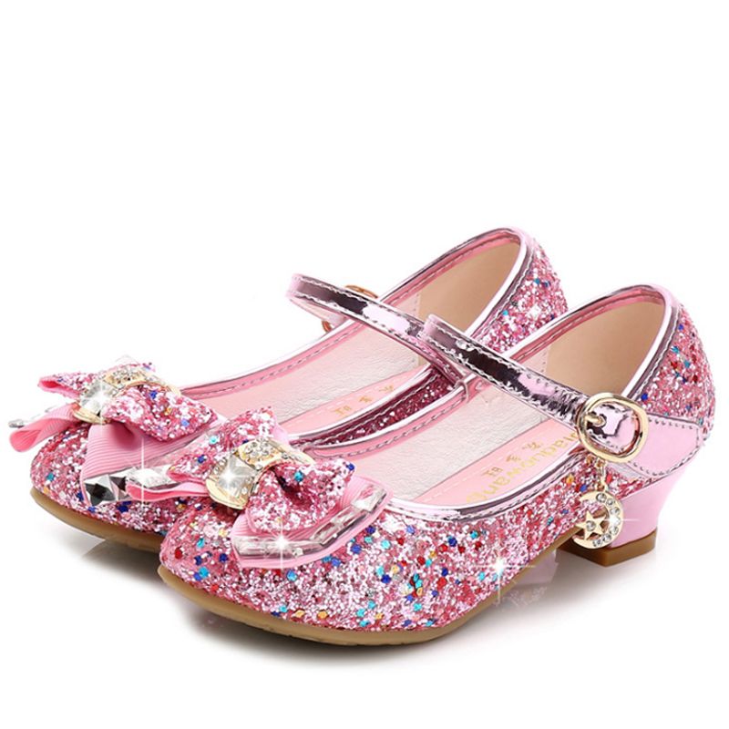Princess Kids Leather Shoes for Girls Flower Casual Glitter Children High Heel Girls Shoes Butterfly Knot Blue Pink Silver