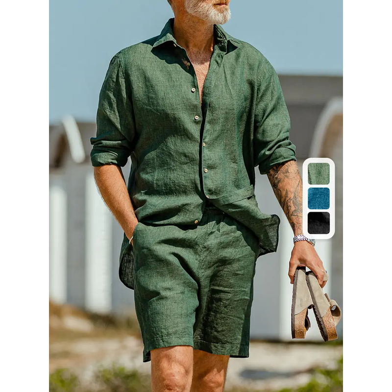Pring Summer Green Casual Long Sleeved Shirt And Shorts Set