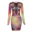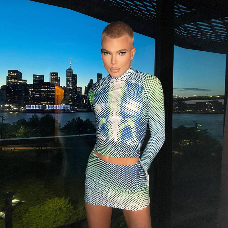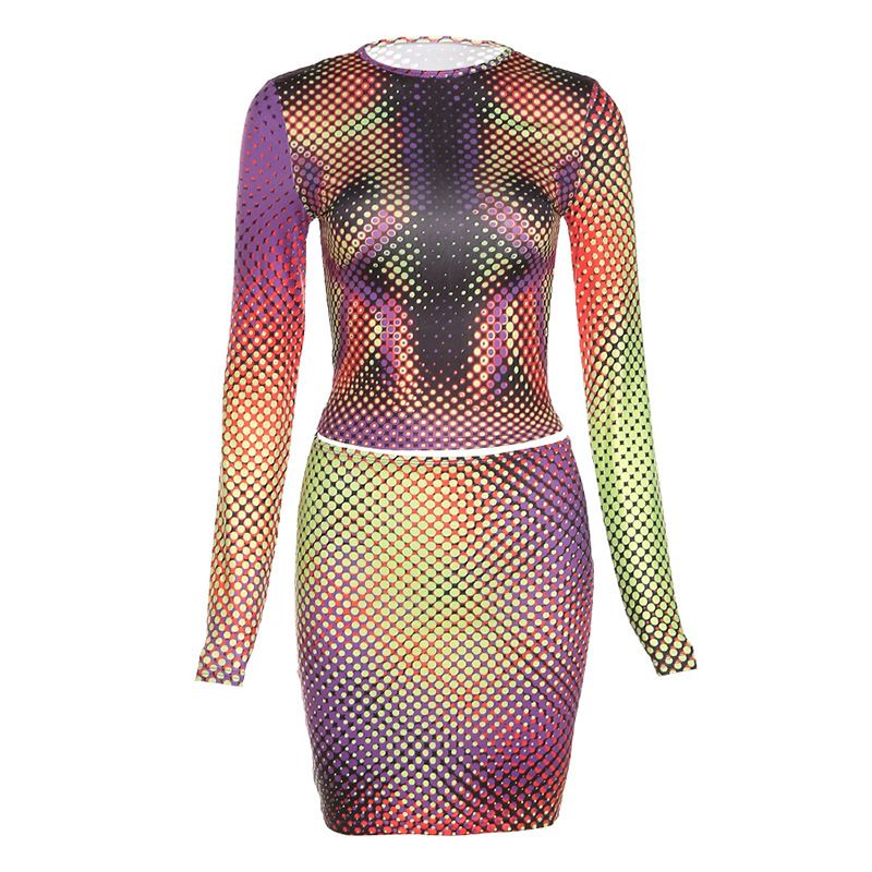Printed Long-sleeved T-shirt High Waist Bag Hip Skirt Casual Suit Purple S